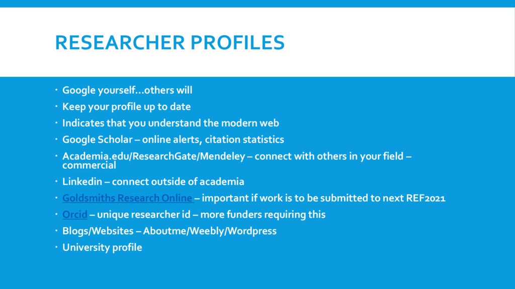 up to date Indicates that you understand the modern web Google Scholar – online alerts, citation statistics Academia.edu/ResearchGate/Mendeley – connect with others in your field – commercial Linkedin – connect outside of academia Goldsmiths Research Online – important if work is to be submitted to next REF2021 Orcid – unique researcher id – more funders requiring this Blogs/Websites – Aboutme/Weebly/Wordpress University profile