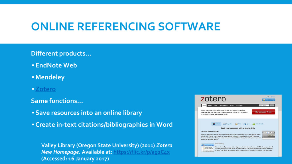 ▪ Zotero Same functions… ▪ Save resources into an online library ▪ Create in-text citations/bibliographies in Word Valley Library (Oregon State University) (2011) Zotero New Homepage. Available at: https://flic.kr/p/ag2C4x (Accessed: 16 January 2017)