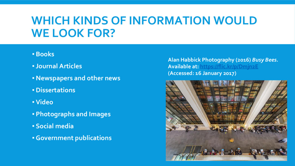 ▪ Journal Articles ▪ Newspapers and other news ▪ Dissertations ▪ Video ▪ Photographs and Images ▪ Social media ▪ Government publications Alan Habbick Photography (2016) Busy Bees. Available at: https://flic.kr/p/Dmjn2E (Accessed: 16 January 2017)