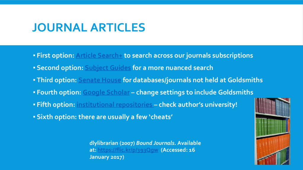 our journals subscriptions ▪ Second option: Subject Guides for a more nuanced search ▪ Third option: Senate House for databases/journals not held at Goldsmiths ▪ Fourth option: Google Scholar – change settings to include Goldsmiths ▪ Fifth option: institutional repositories – check author’s university! ▪ Sixth option: there are usually a few ‘cheats’ dlylibrarian (2007) Bound Journals. Available at: https://flic.kr/p/393Qgw (Accessed: 16 January 2017)