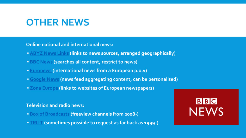 Links (links to news sources, arranged geographically) ▪ BBC News (searches all content, restrict to news) ▪ Euronews (international news from a European p.o.v) ▪ Google News (news feed aggregating content, can be personalised) ▪ Zona Europe (links to websites of European newspapers) Television and radio news: ▪ Box of Broadcasts (freeview channels from 2008-) ▪ TRILT (sometimes possible to request as far back as 1999-)