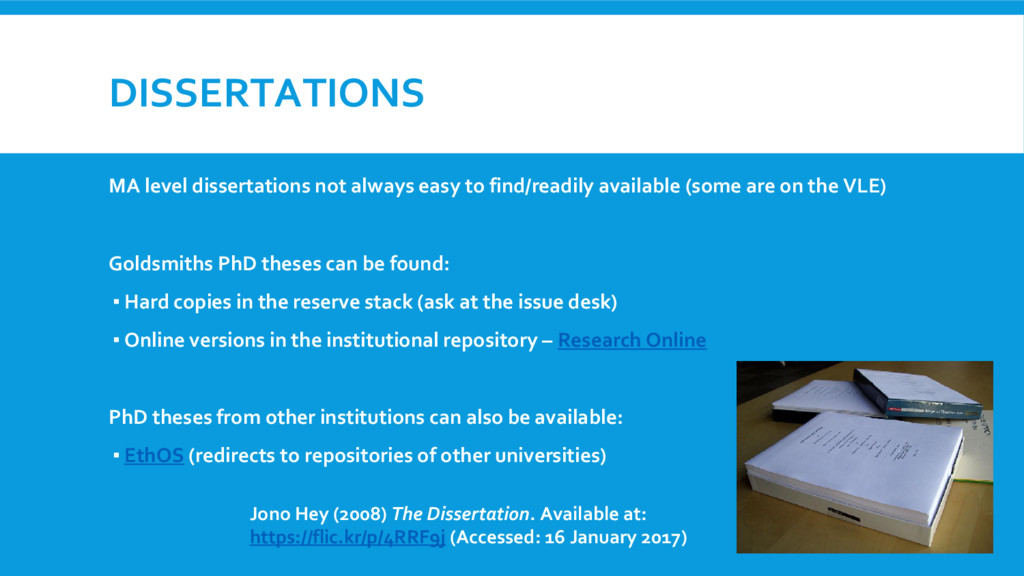 (some are on the VLE) Goldsmiths PhD theses can be found: ▪ Hard copies in the reserve stack (ask at the issue desk) ▪ Online versions in the institutional repository – Research Online PhD theses from other institutions can also be available: ▪ EthOS (redirects to repositories of other universities) Jono Hey (2008) The Dissertation. Available at: https://flic.kr/p/4RRF9j (Accessed: 16 January 2017)