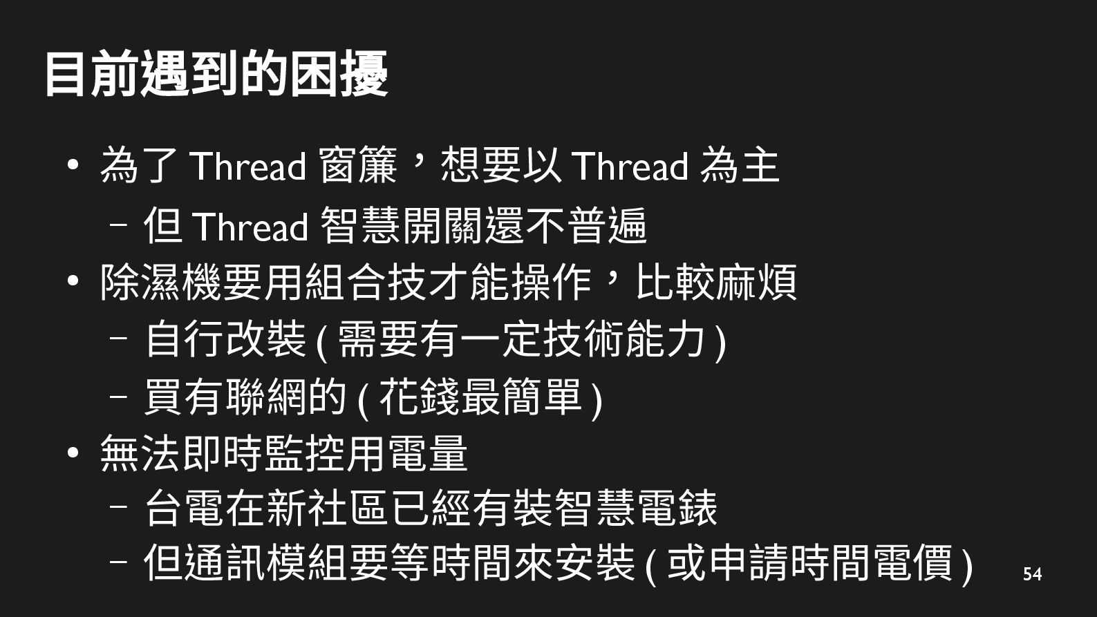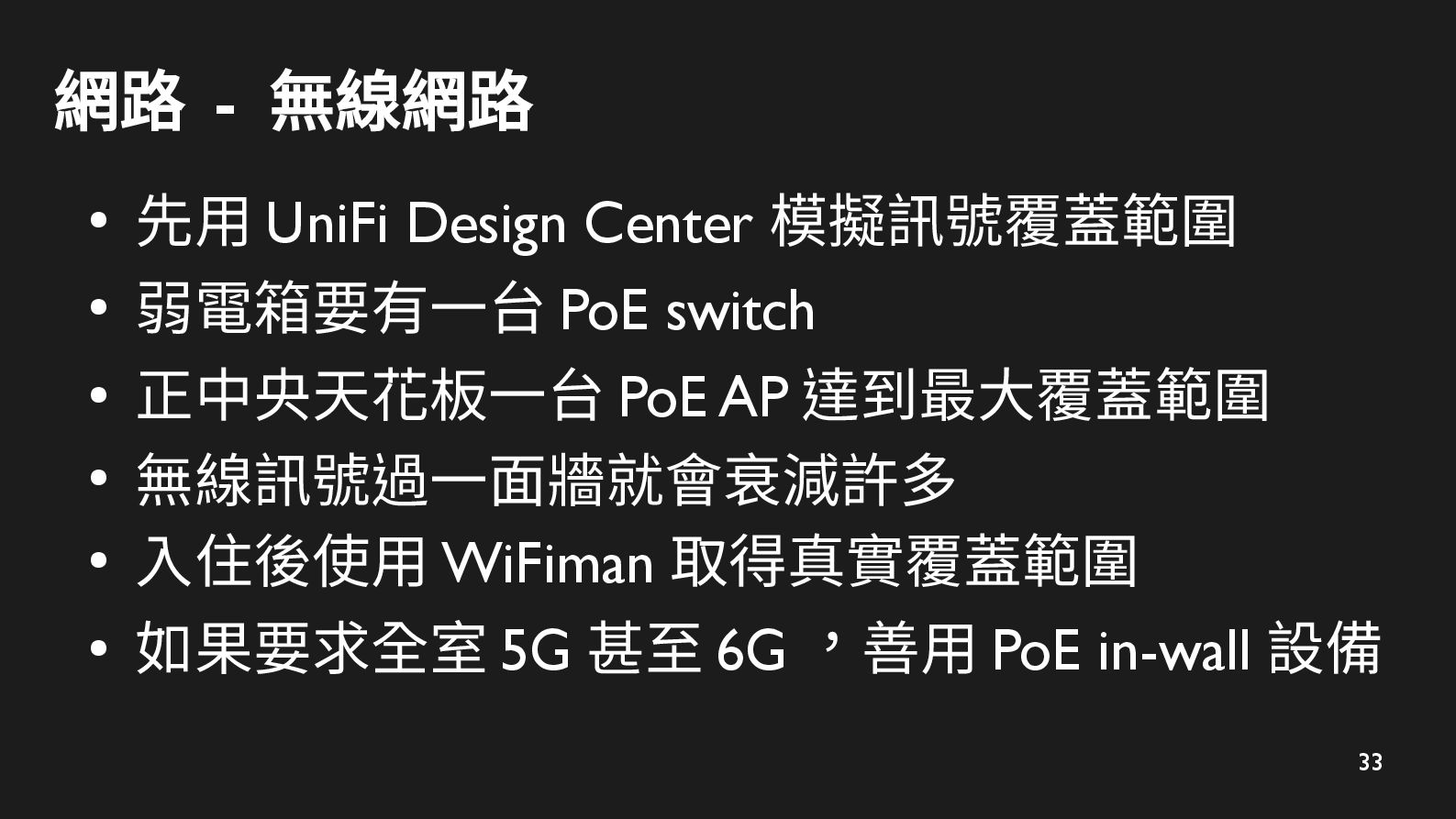 本場分享將從我親身經歷的新家裝潢談起,身為一位資深軟體工程師,如何在有限的時間與施工條件下,活用本業經驗規劃弱電走線、WiFi 訊號模擬、設備協定選型、網路基礎建設,並整合 Home Assistant 與 UniFi 網路管理系統,打造一個能穩定運作、自動回應情境、符合生活節奏的智慧家庭。過程中踩過的坑不勝枚舉,包括: