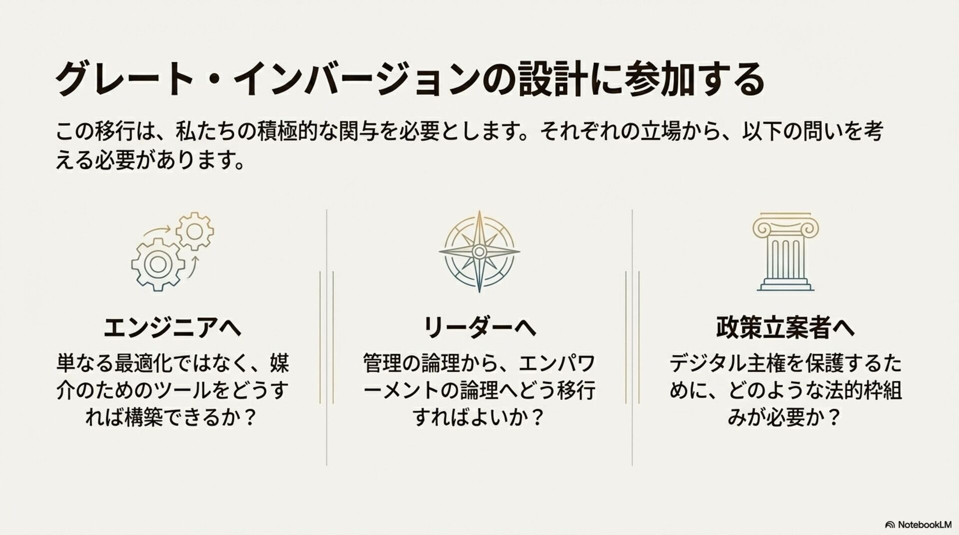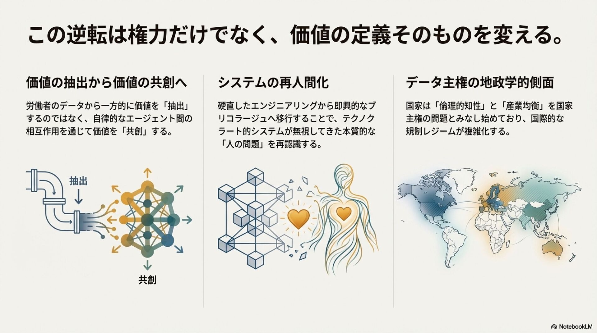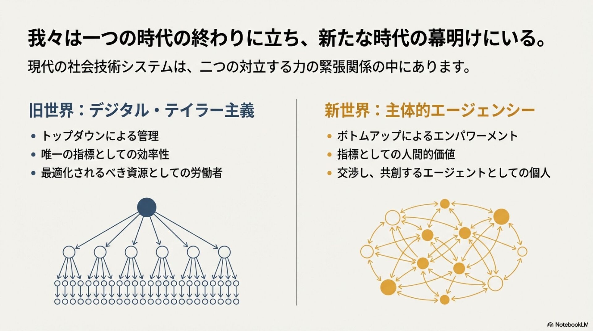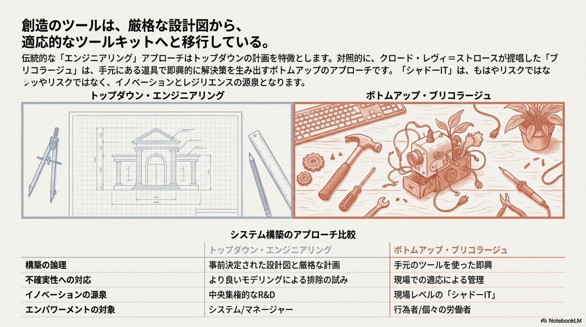 ソブリンエージェントの思考と、トップダウン型システムによる統制から、シャドーIT/ビリコラージュ的なボトムアップ型のシステムへの期待を中心にPerplexityで深掘りし、NotebookLMで資料化した。