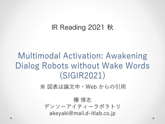 IR Reading 2021 秋にて紹介した "Multimodal Activation: Awakening Dialog Robots without Wake Words" の概要スライドです.Dialog Robots (AI スピーカー) のWake Word (ロボットを activate する合図) を省略する研究です.不適切な記述などがあればご指摘頂ければ幸いです .