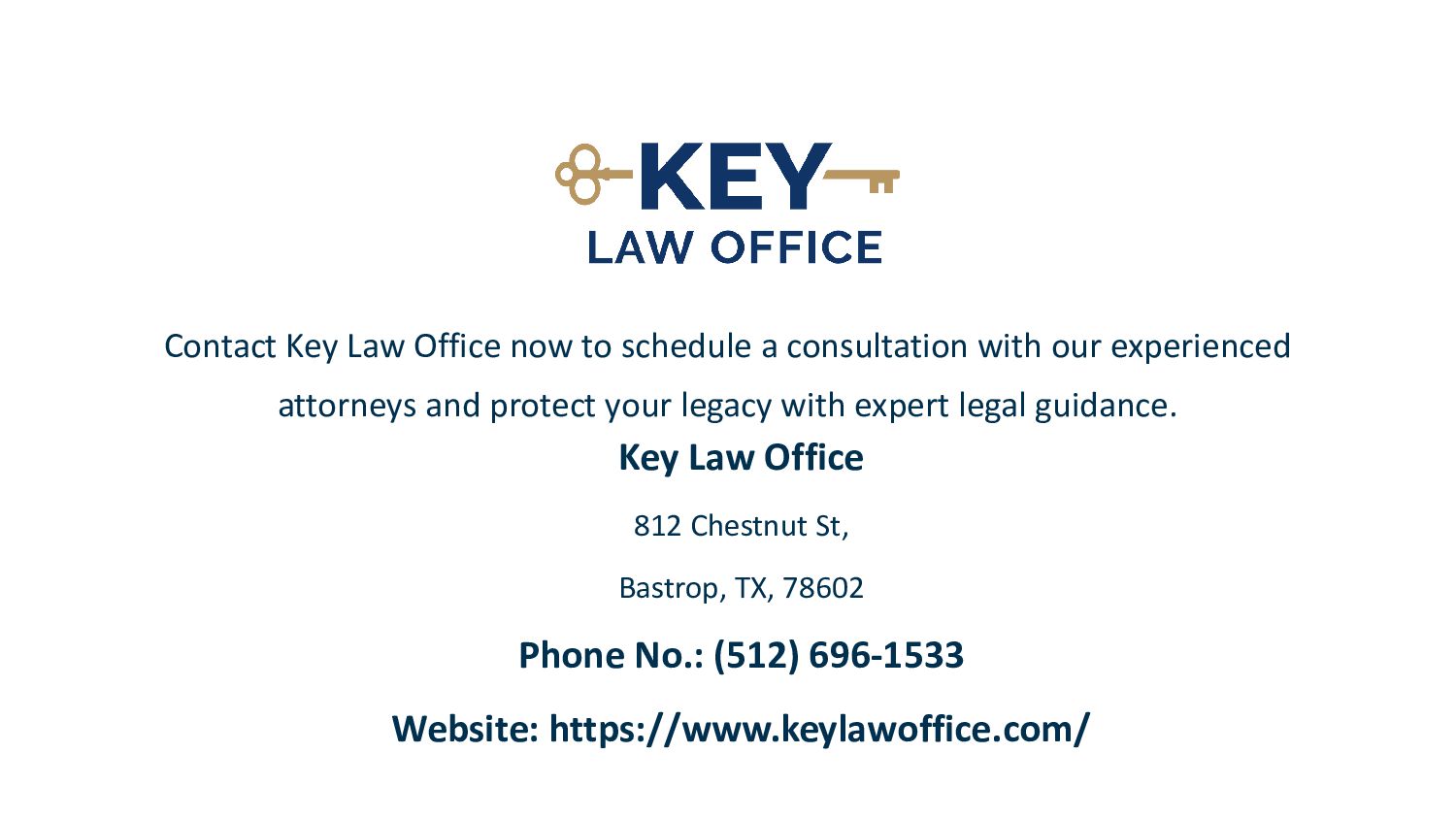 https://www.keylawoffice.com/practice-areas/estate-planning/ : Plan for tomorrow with our professional estate planning attorneys in Bastrop, TX, specializing in wills, trusts, and end-of-life planning. Key Law Office offers expert services in estate planning, mediation, probate law, law enforcement legal support, and child support advocacy. Contact us today!