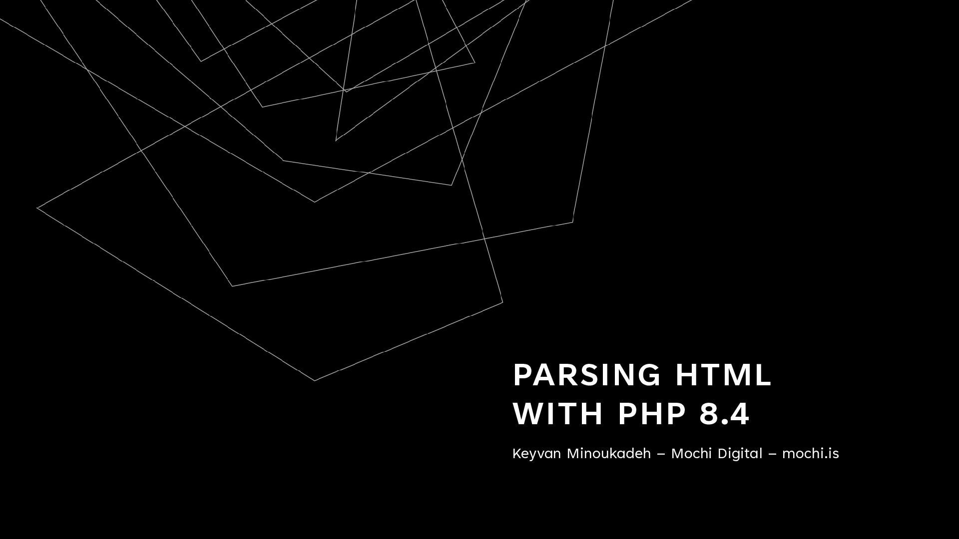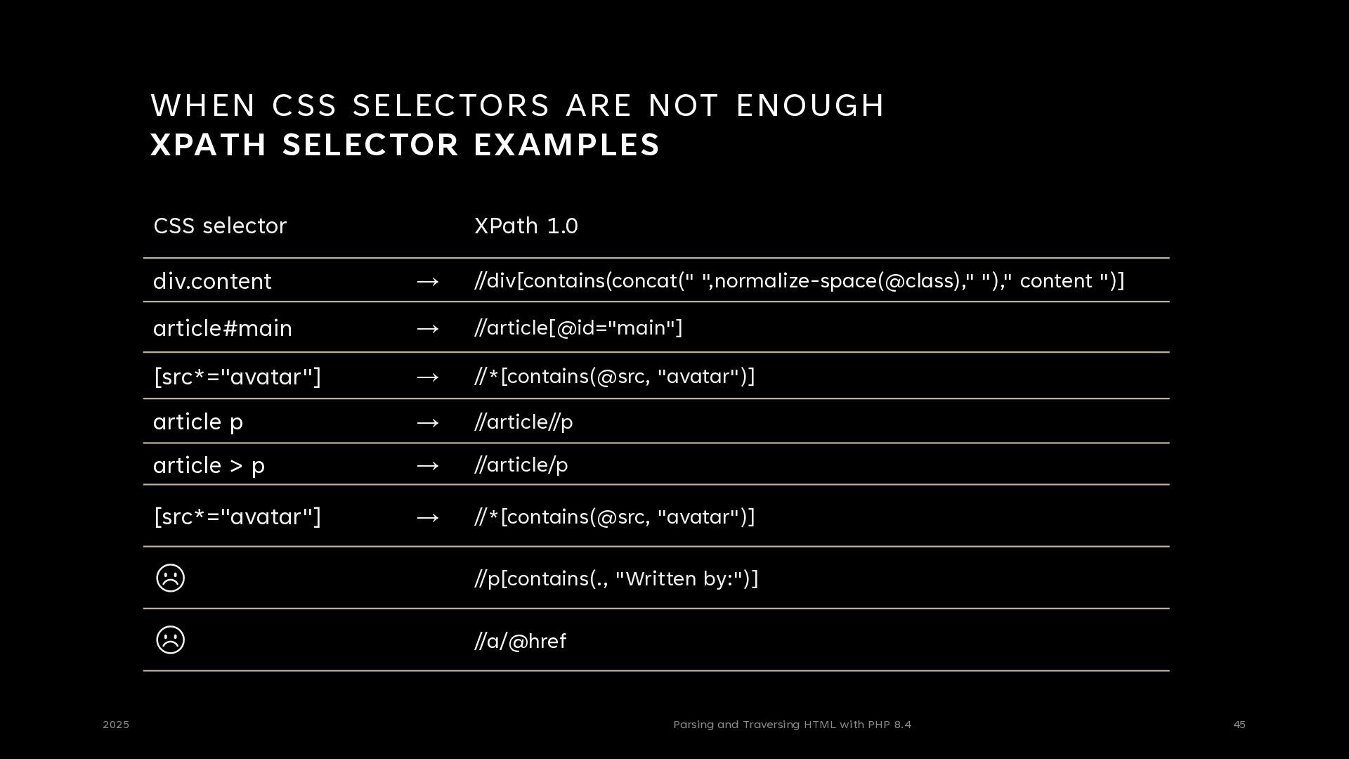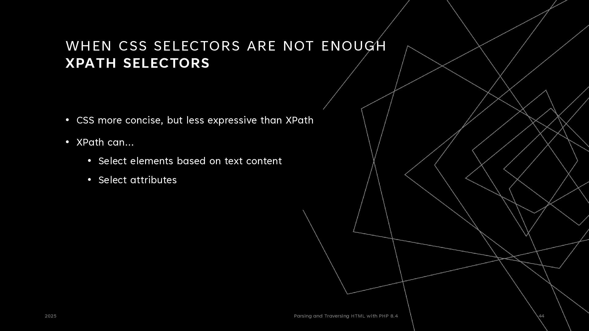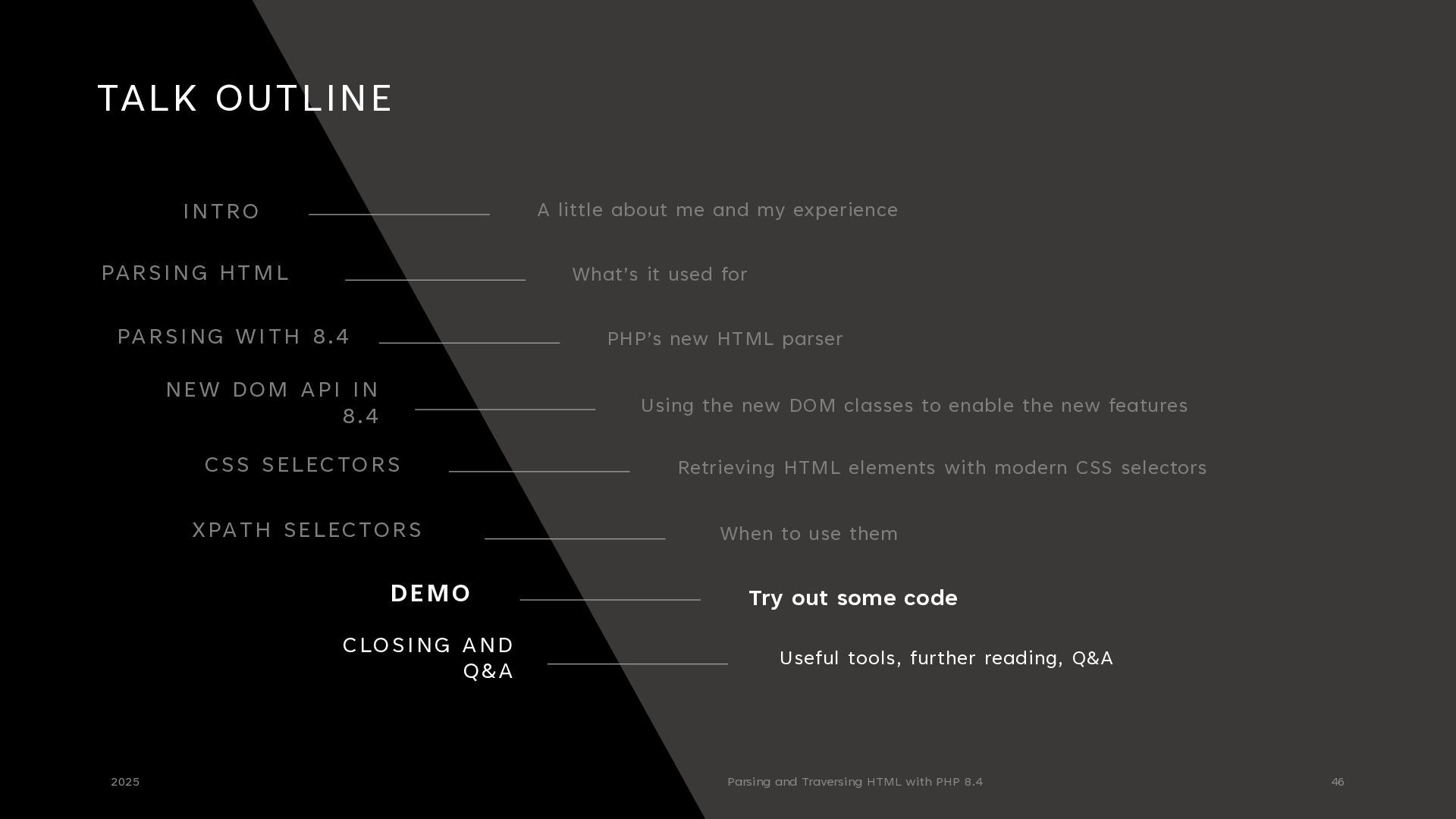 about me and my experience PHP’s new HTML parser Retrieving HTML elements with modern CSS selectors Try out some code 2025 Parsing and Traversing HTML with PHP 8.4 46 PARSING HTML What’s it used for Using the new DOM classes to enable the new features XPATH SELECTORS When to use them CLOSING AND Q&A Useful tools, further reading, Q&A INTRO NEW DOM API IN 8.4