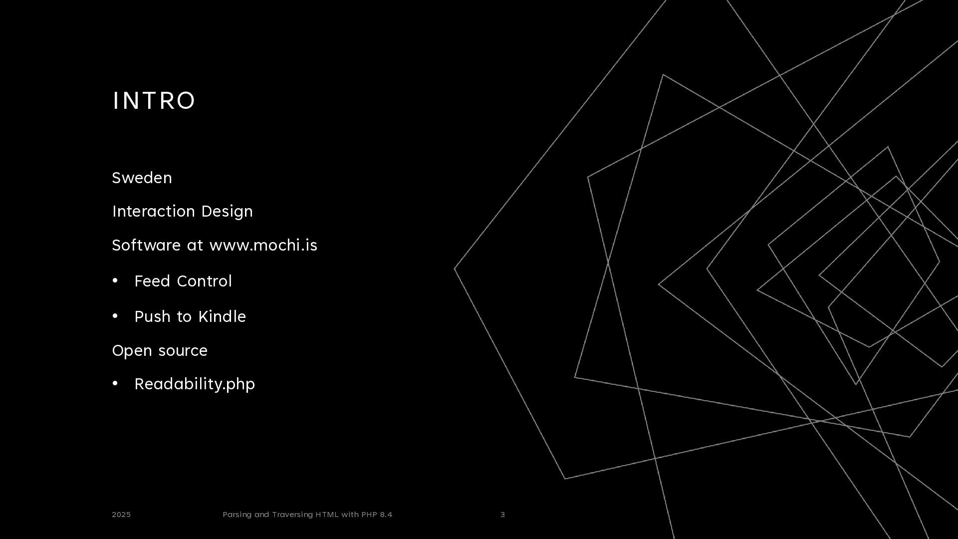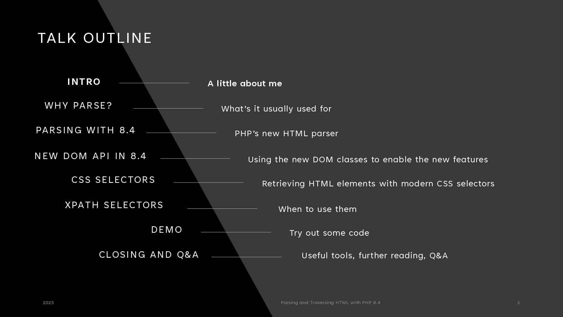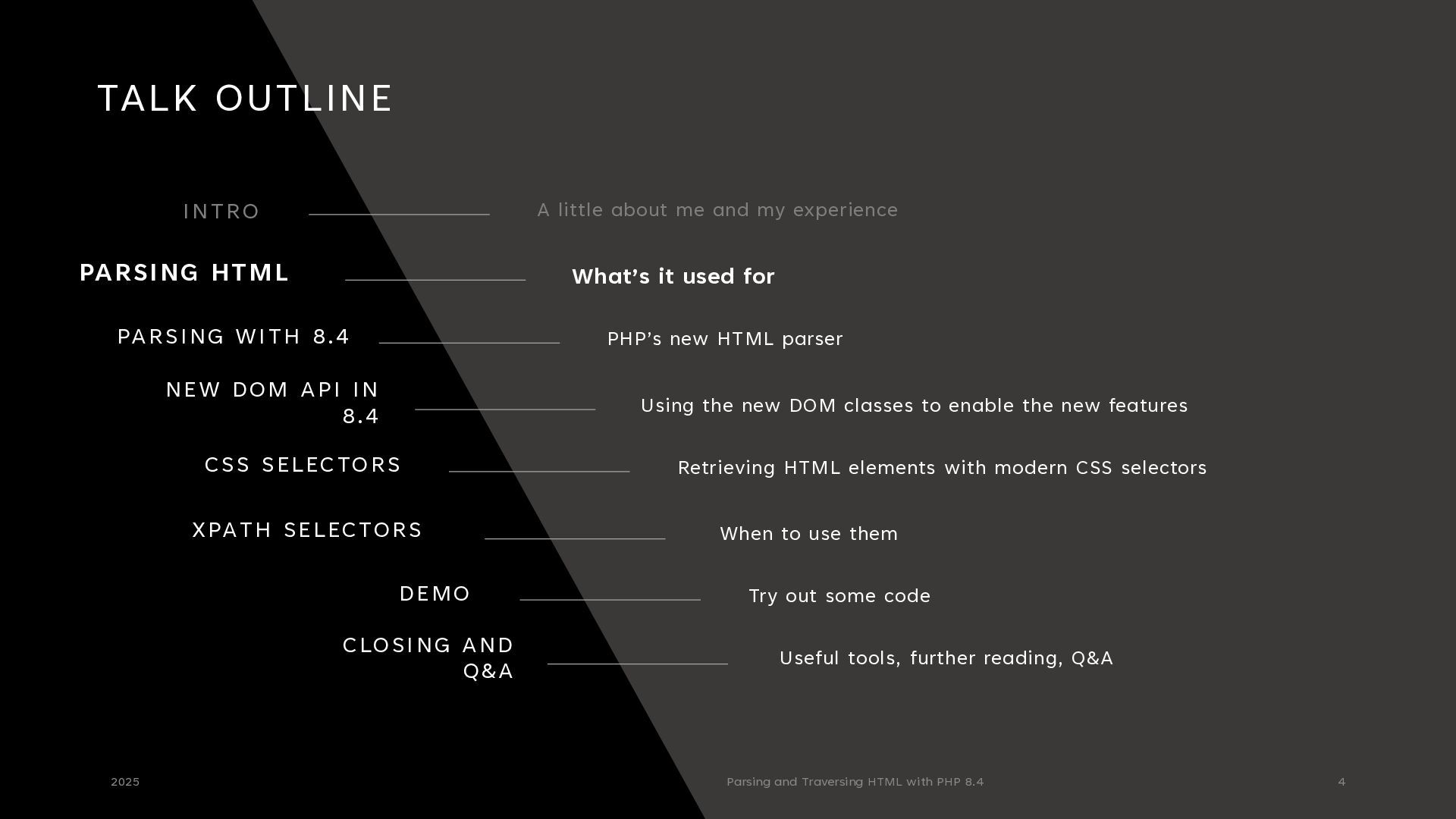 about me PHP’s new HTML parser Retrieving HTML elements with modern CSS selectors Try out some code 2025 Parsing and Traversing HTML with PHP 8.4 2 WHY PARSE? What’s it usually used for Using the new DOM classes to enable the new features XPATH SELECTORS When to use them CLOSING AND Q&A Useful tools, further reading, Q&A INTRO NEW DOM API IN 8.4