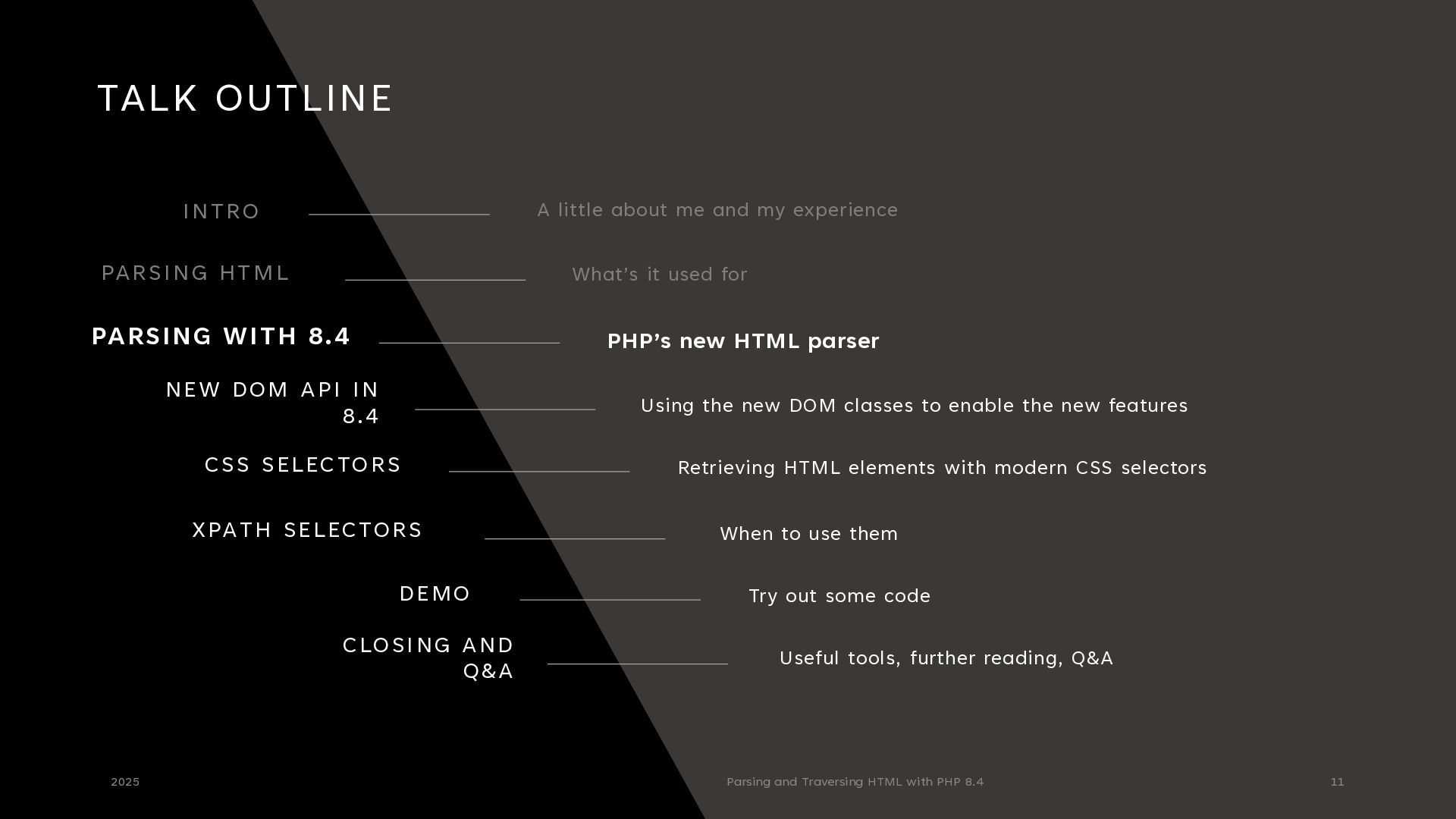 about me and my experience PHP’s new HTML parser Retrieving HTML elements with modern CSS selectors Try out some code 2025 Parsing and Traversing HTML with PHP 8.4 11 PARSING HTML What’s it used for Using the new DOM classes to enable the new features XPATH SELECTORS When to use them CLOSING AND Q&A Useful tools, further reading, Q&A INTRO NEW DOM API IN 8.4