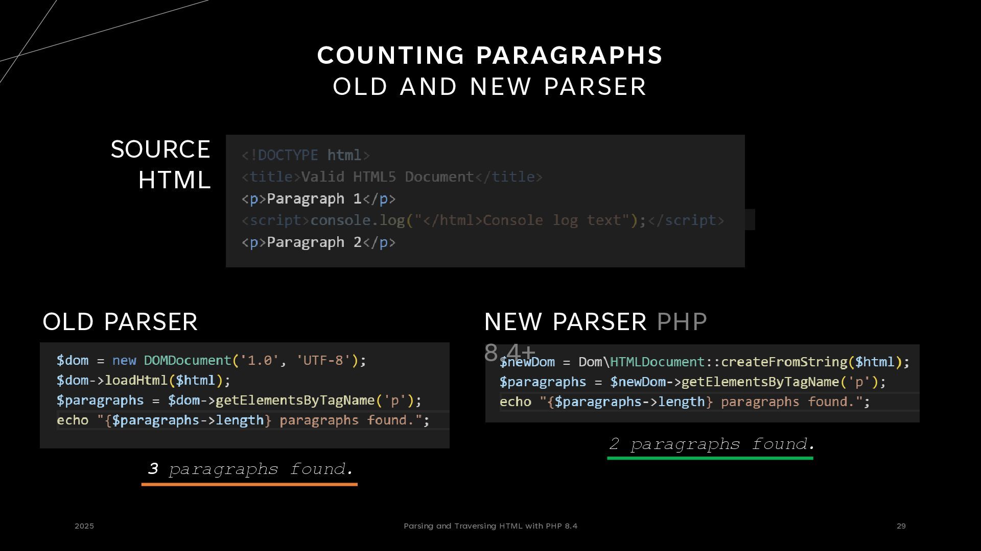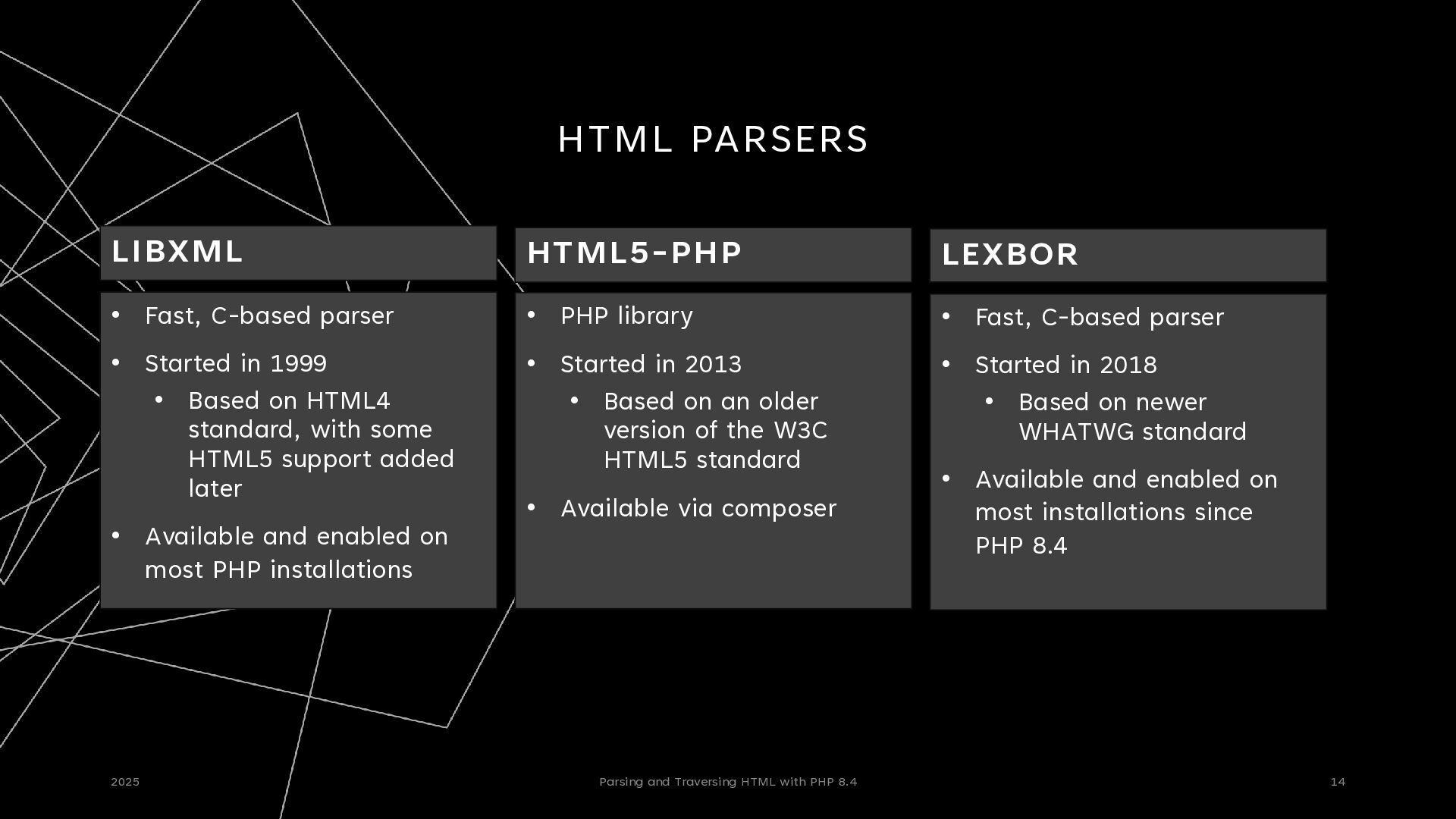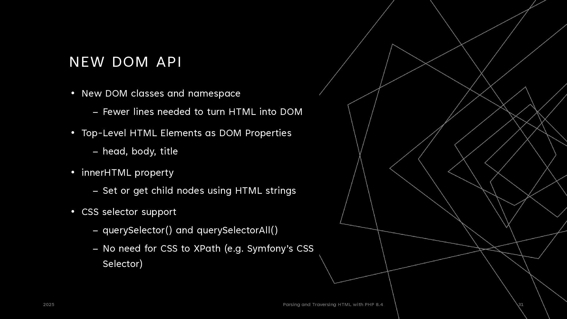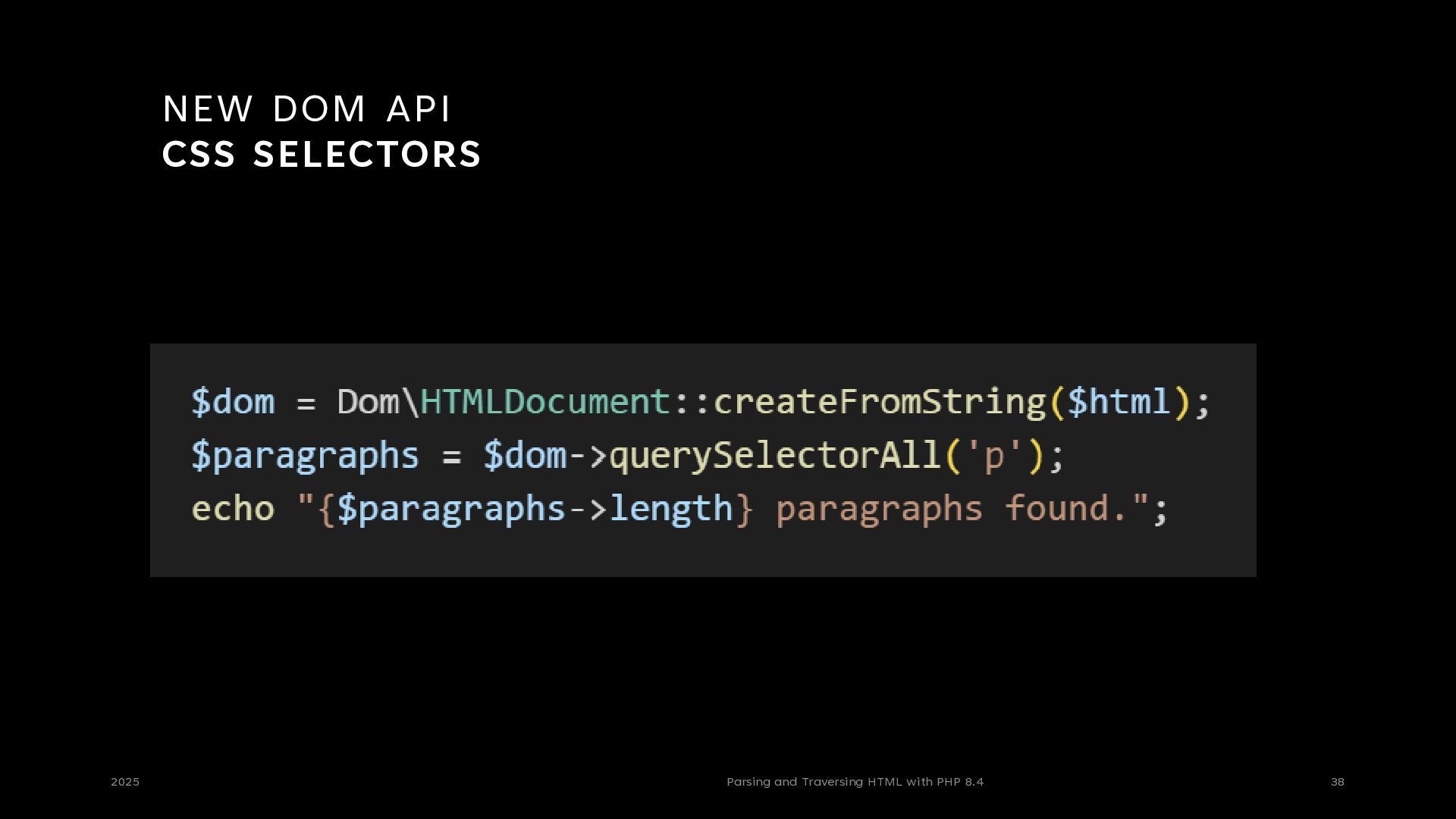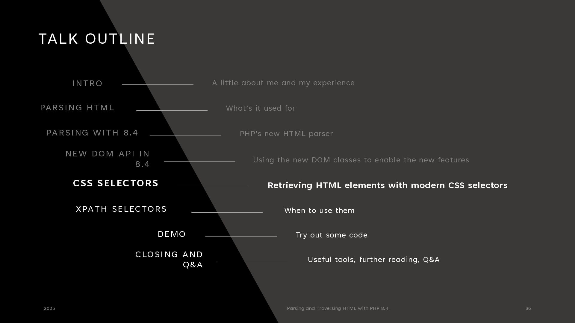 about me and my experience PHP’s new HTML parser Retrieving HTML elements with modern CSS selectors Try out some code 2025 Parsing and Traversing HTML with PHP 8.4 36 PARSING HTML What’s it used for Using the new DOM classes to enable the new features XPATH SELECTORS When to use them CLOSING AND Q&A Useful tools, further reading, Q&A INTRO NEW DOM API IN 8.4