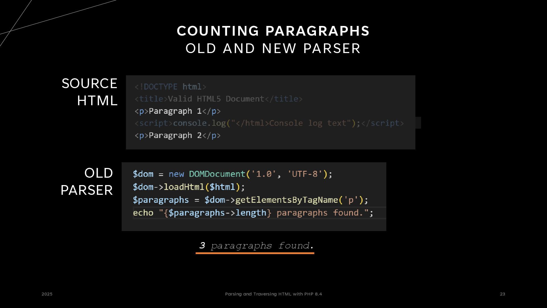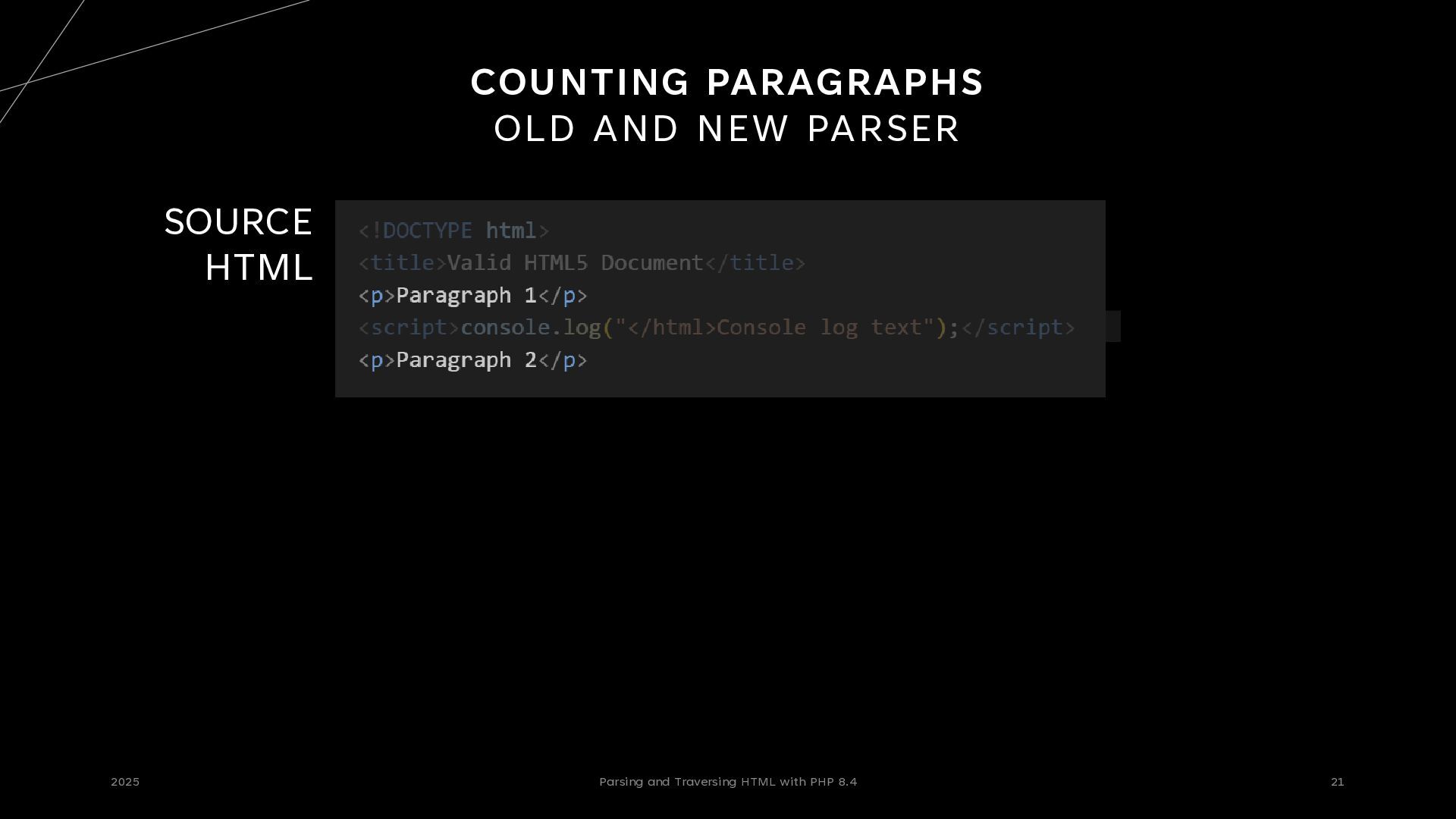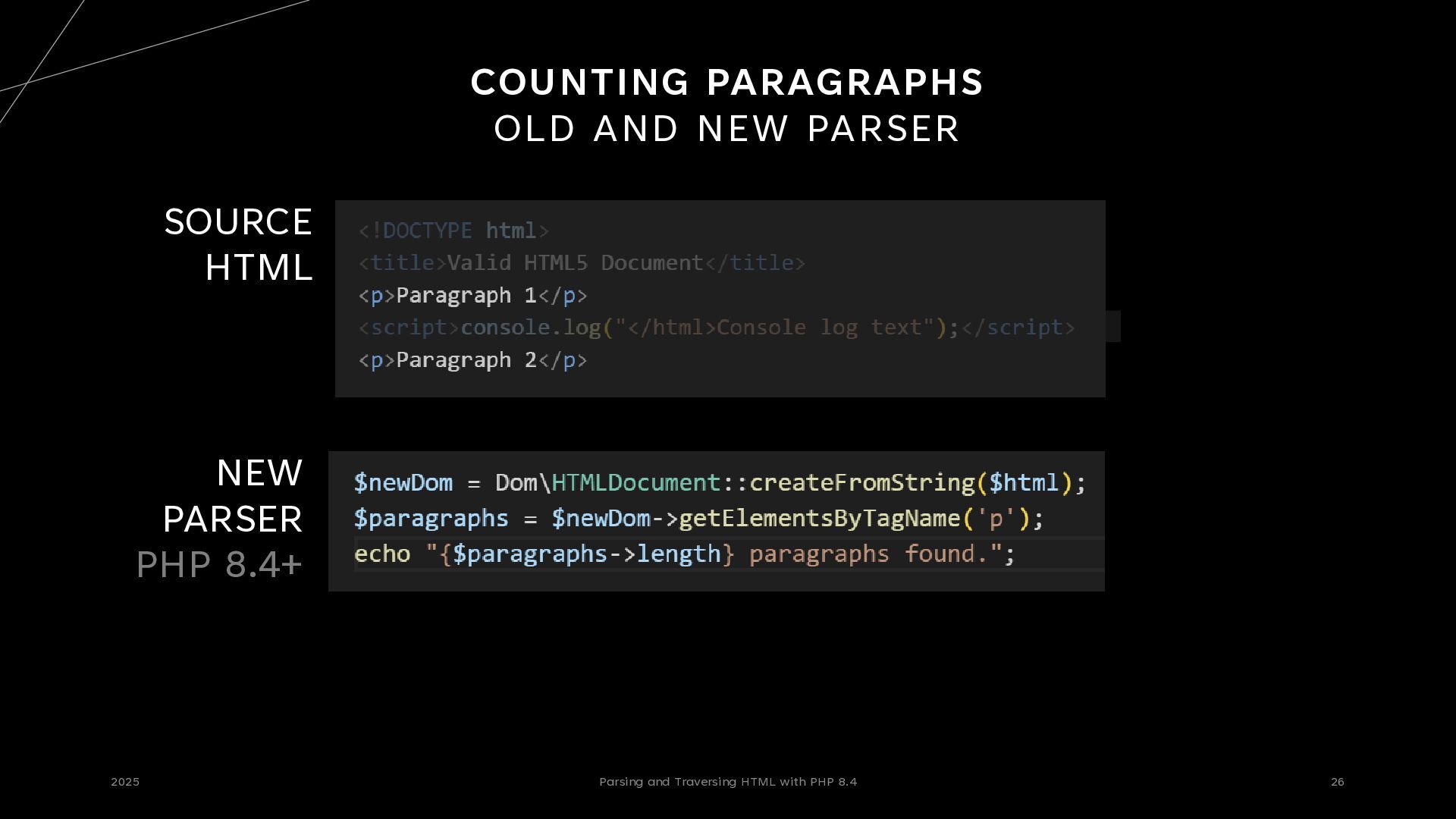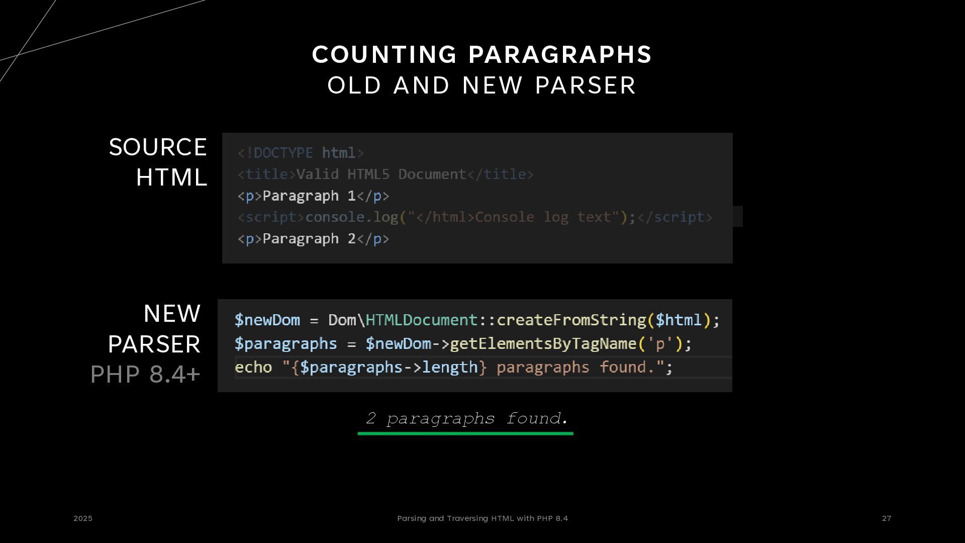about me and my experience PHP’s new HTML parser Retrieving HTML elements with modern CSS selectors Try out some code 2025 Parsing and Traversing HTML with PHP 8.4 36 PARSING HTML What’s it used for Using the new DOM classes to enable the new features XPATH SELECTORS When to use them CLOSING AND Q&A Useful tools, further reading, Q&A INTRO NEW DOM API IN 8.4
