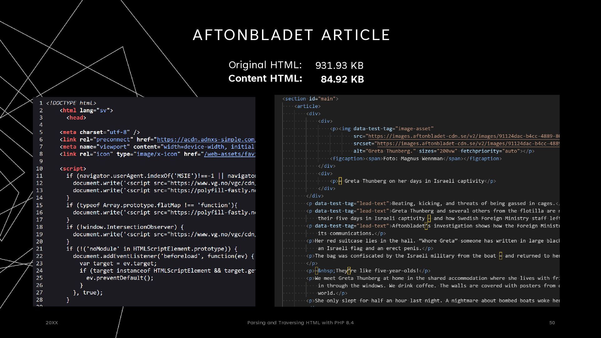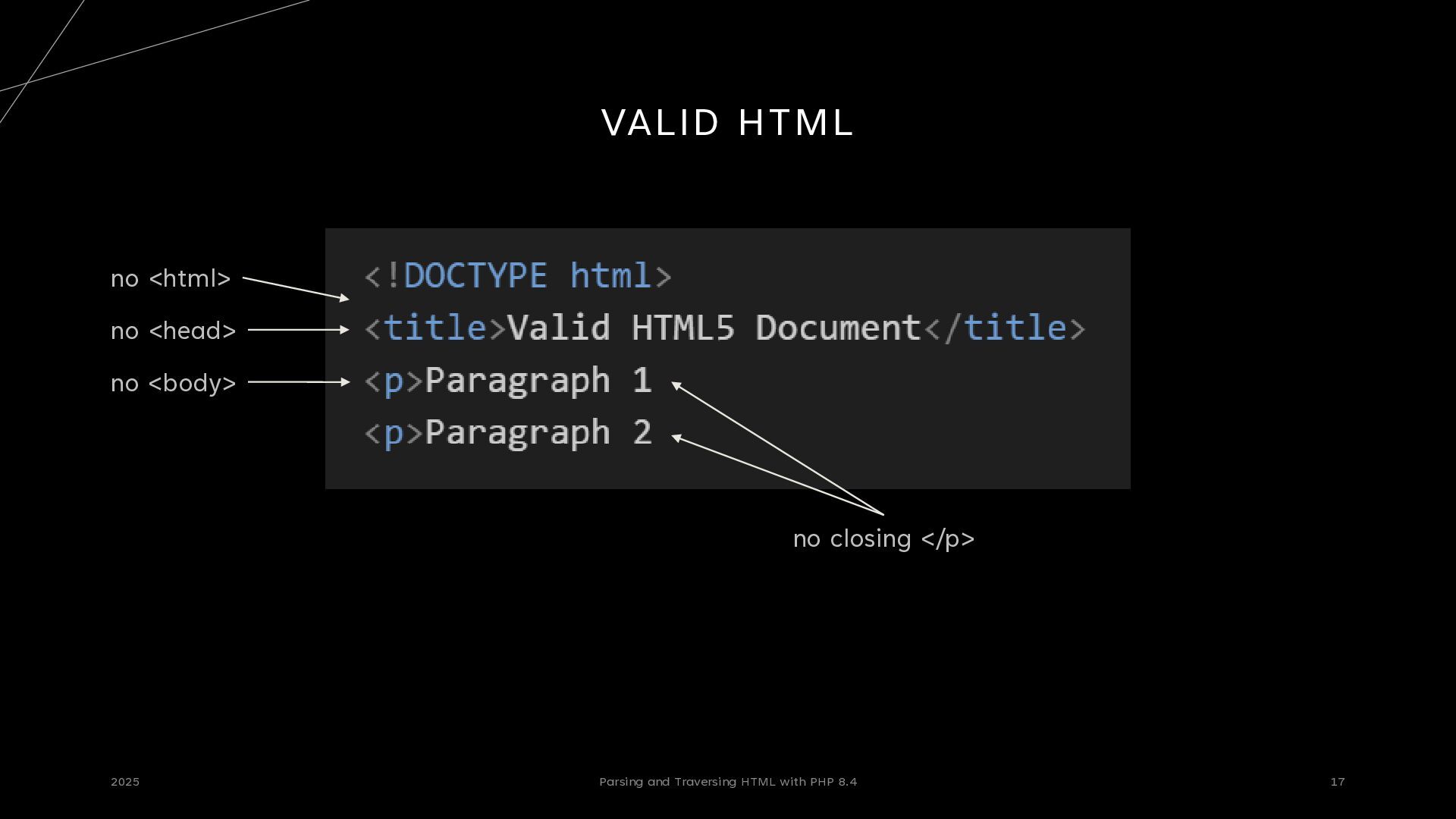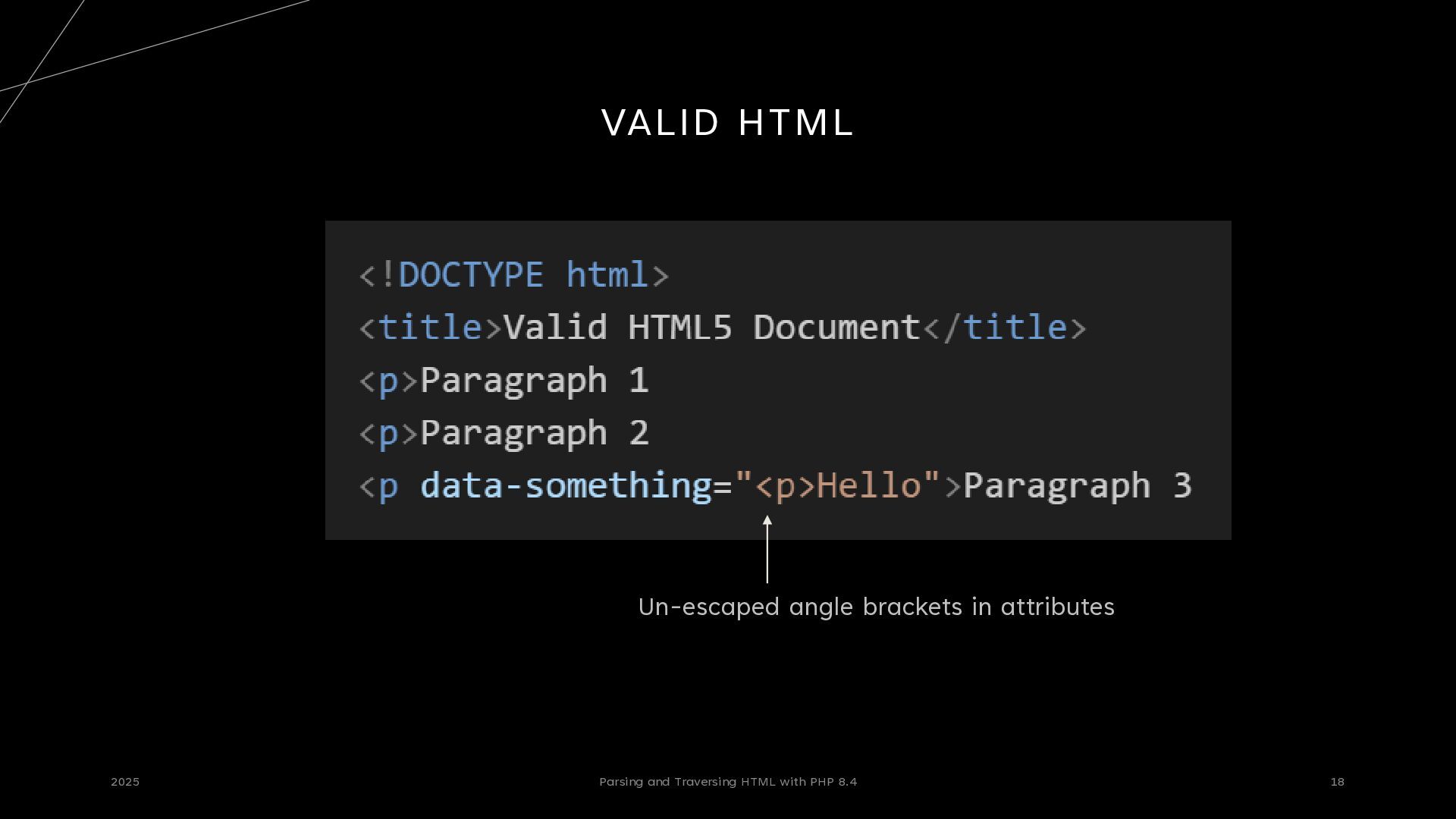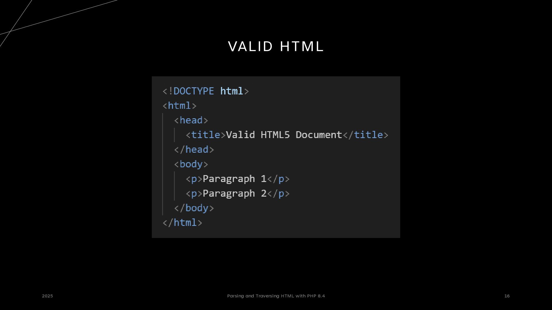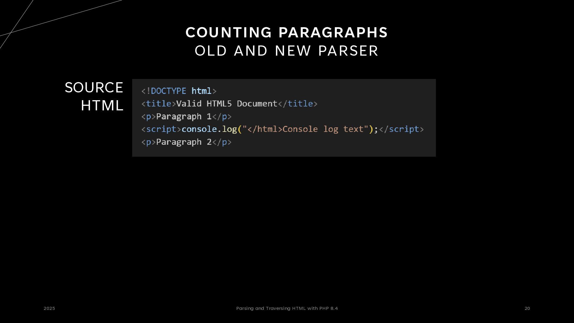 about me and my experience PHP’s new HTML parser Retrieving HTML elements with modern CSS selectors Try out some code 2025 Parsing and Traversing HTML with PHP 8.4 36 PARSING HTML What’s it used for Using the new DOM classes to enable the new features XPATH SELECTORS When to use them CLOSING AND Q&A Useful tools, further reading, Q&A INTRO NEW DOM API IN 8.4