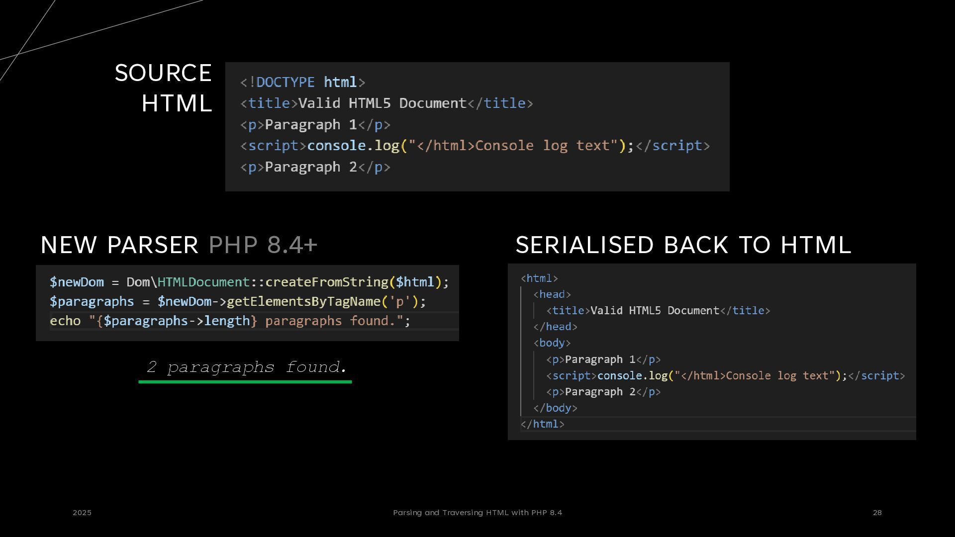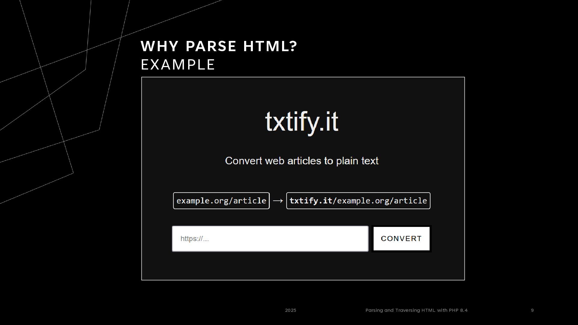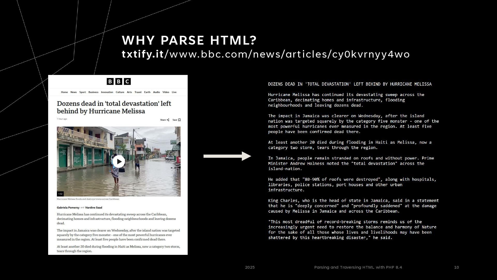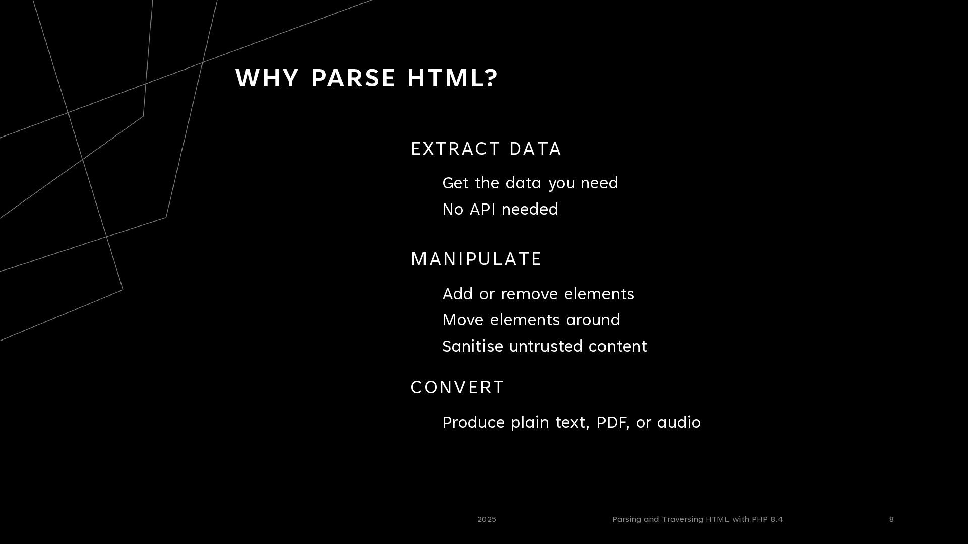 No API needed MANIPULATE Add or remove elements Move elements around Sanitise untrusted content CONVERT Produce plain text, PDF, or audio 2025 Parsing and Traversing HTML with PHP 8.4 8