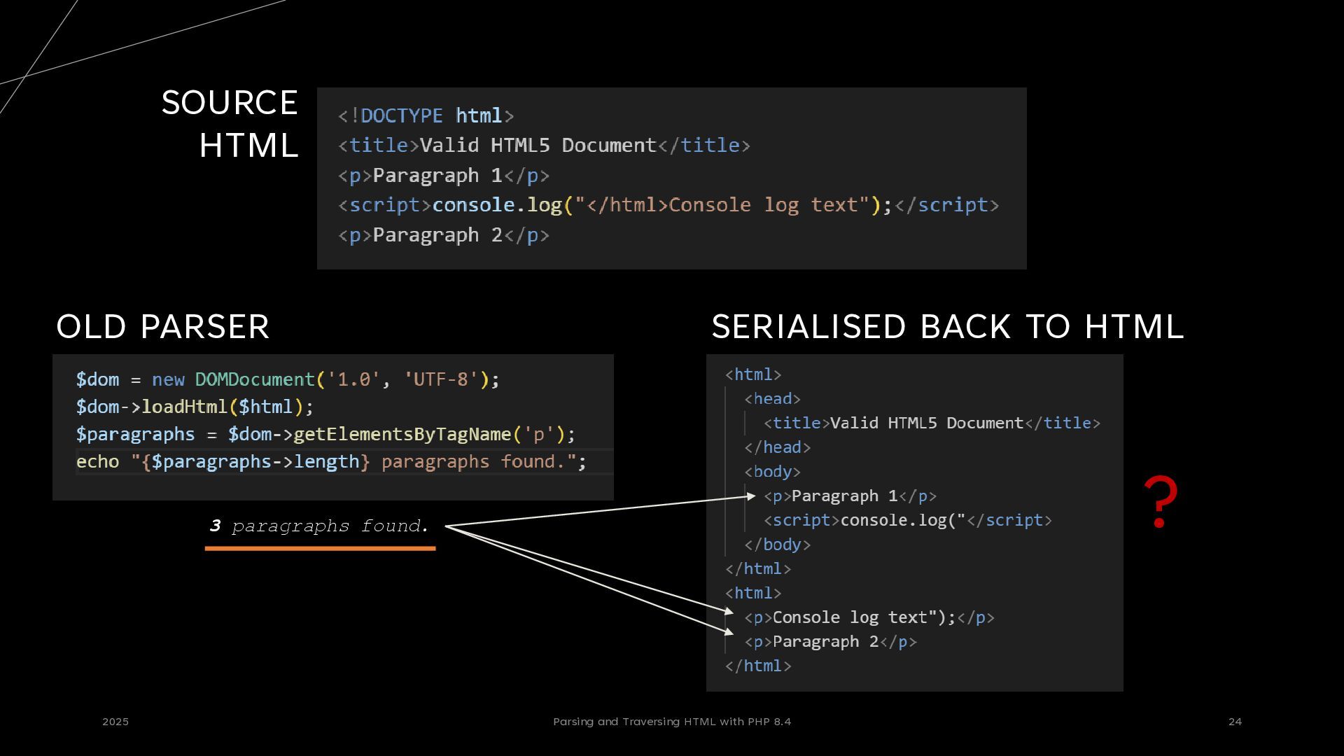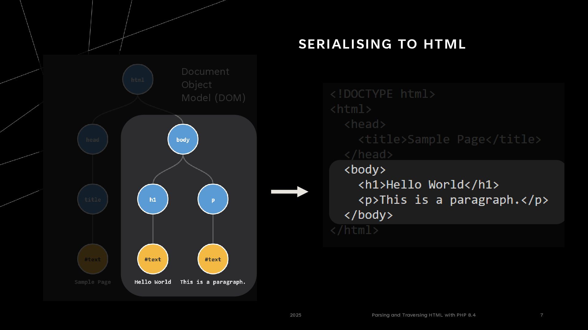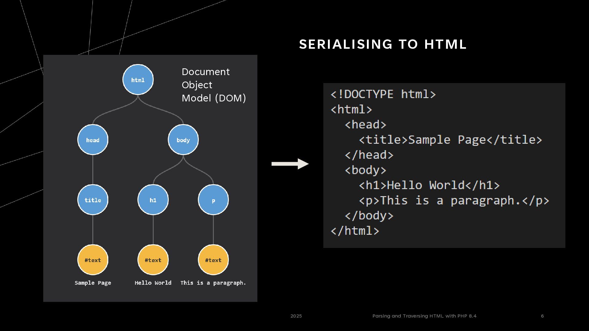 No API needed MANIPULATE Add or remove elements Move elements around Sanitise untrusted content CONVERT Produce plain text, PDF, or audio 2025 Parsing and Traversing HTML with PHP 8.4 8