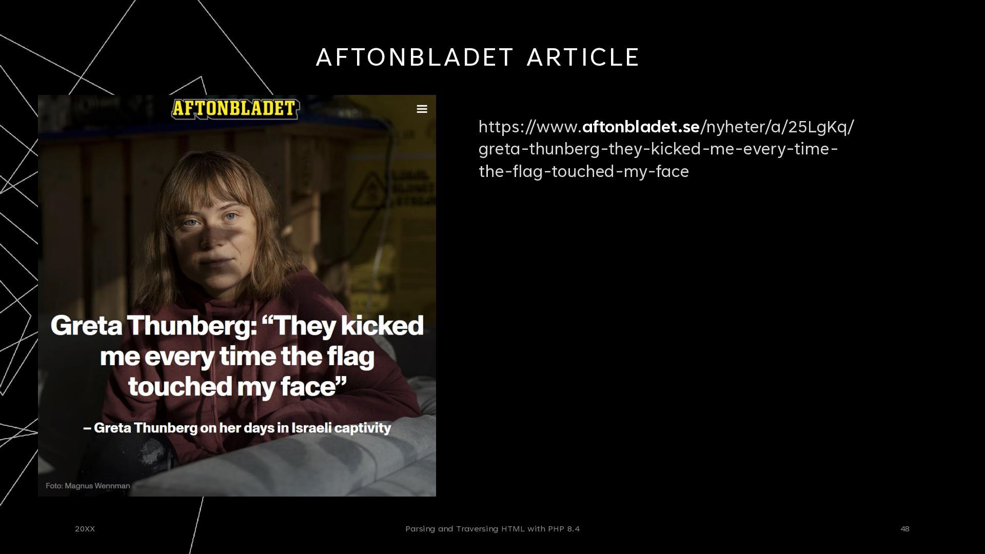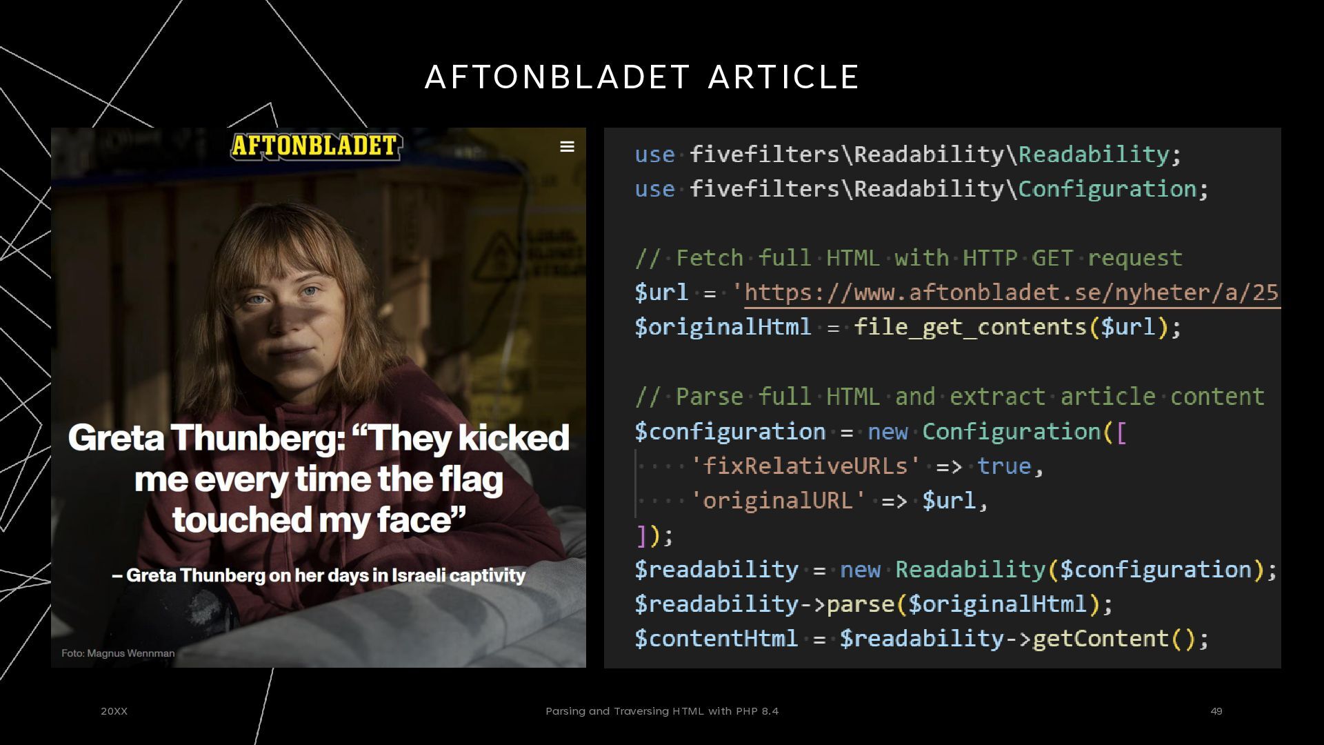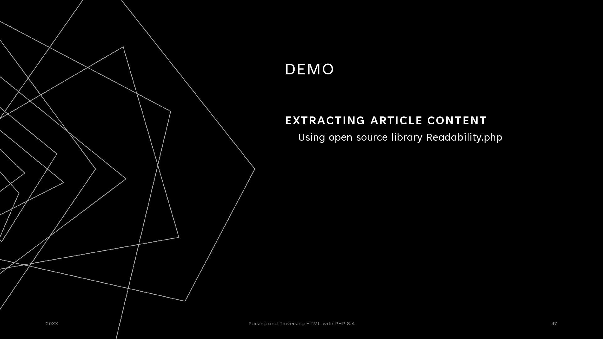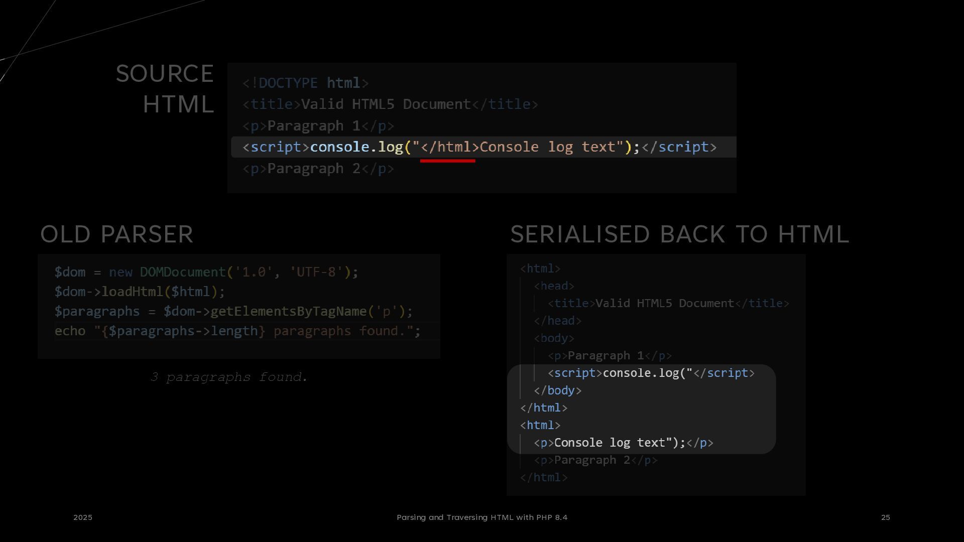 No API needed MANIPULATE Add or remove elements Move elements around Sanitise untrusted content CONVERT Produce plain text, PDF, or audio 2025 Parsing and Traversing HTML with PHP 8.4 8