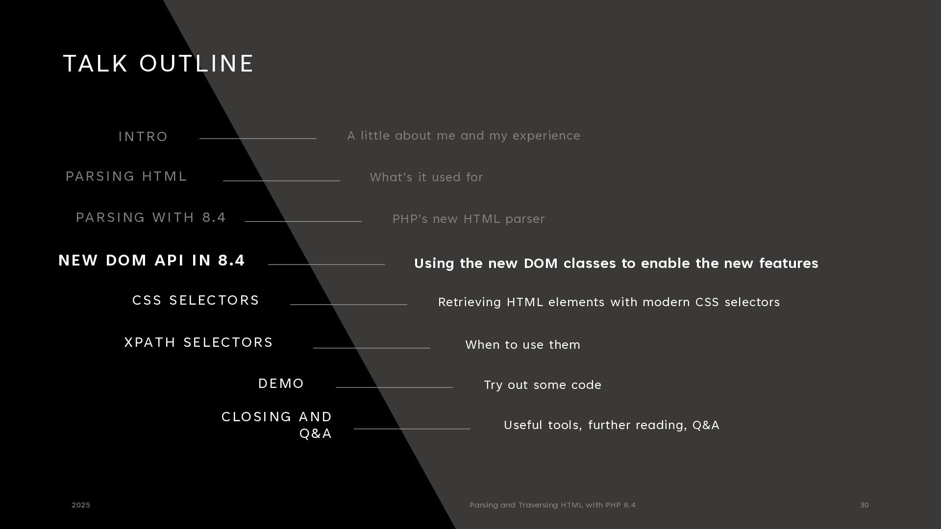 about me and my experience PHP’s new HTML parser Retrieving HTML elements with modern CSS selectors Try out some code 2025 Parsing and Traversing HTML with PHP 8.4 30 PARSING HTML What’s it used for Using the new DOM classes to enable the new features XPATH SELECTORS When to use them CLOSING AND Q&A Useful tools, further reading, Q&A INTRO NEW DOM API IN 8.4