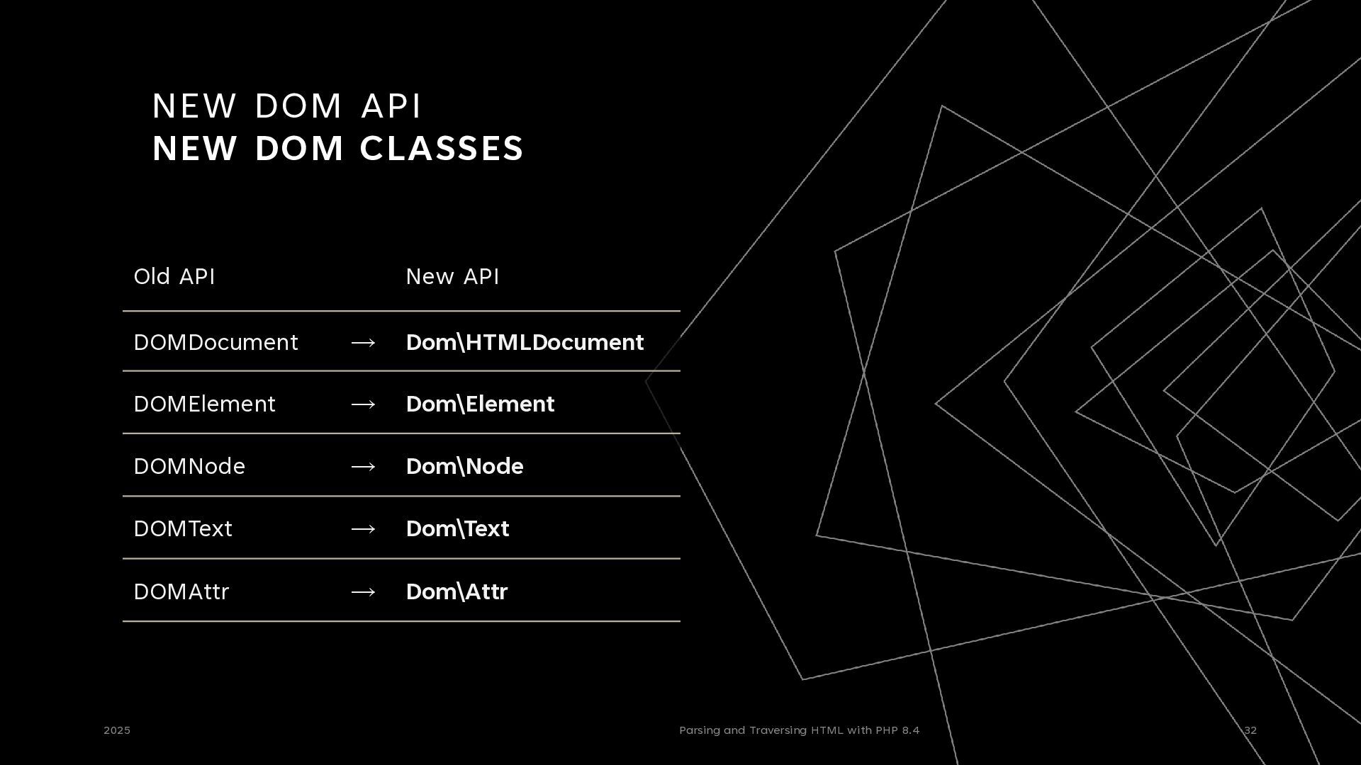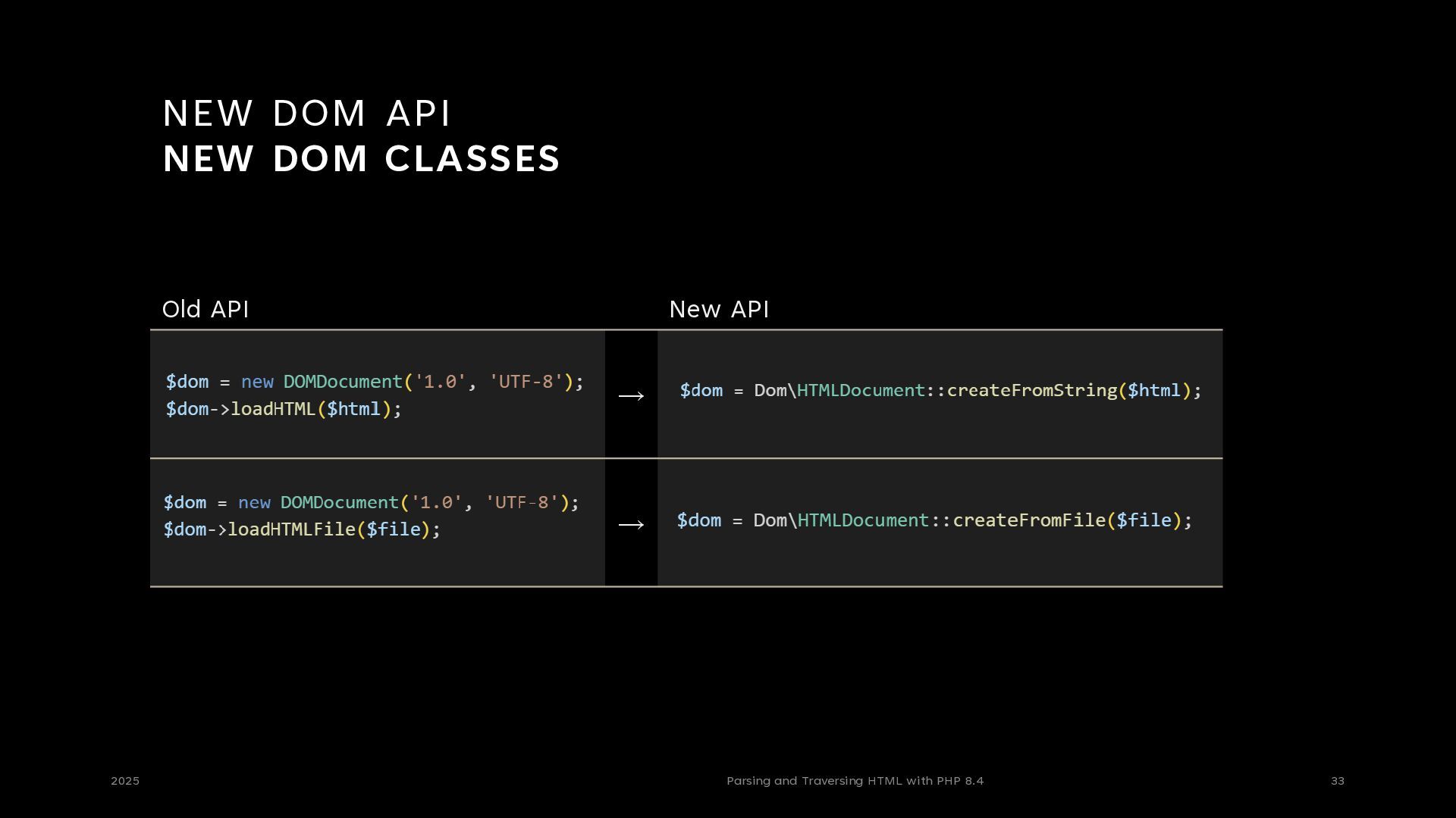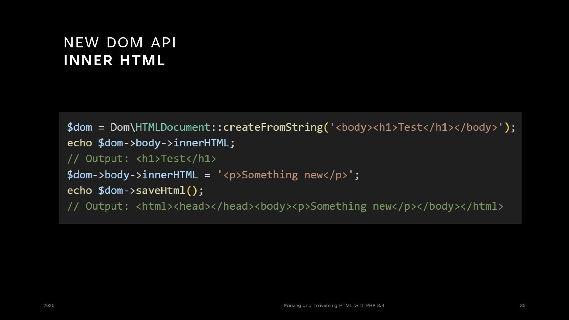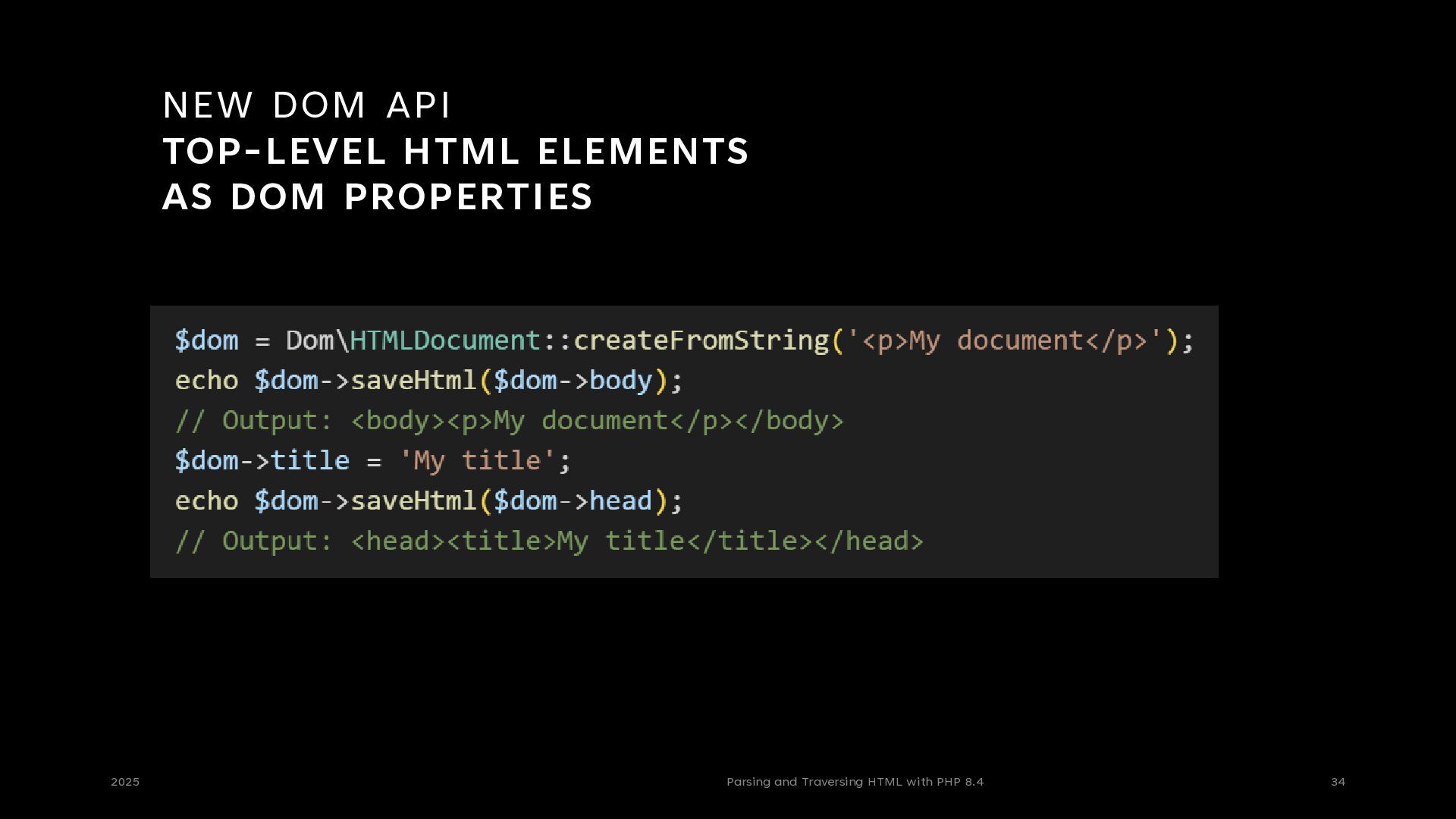 Fewer lines needed to turn HTML into DOM • Top-Level HTML Elements as DOM Properties – head, body, title • innerHTML property – Set or get child nodes using HTML strings • CSS selector support – querySelector() and querySelectorAll() – No need for CSS to XPath (e.g. Symfony’s CSS Selector) 2025 Parsing and Traversing HTML with PHP 8.4 31