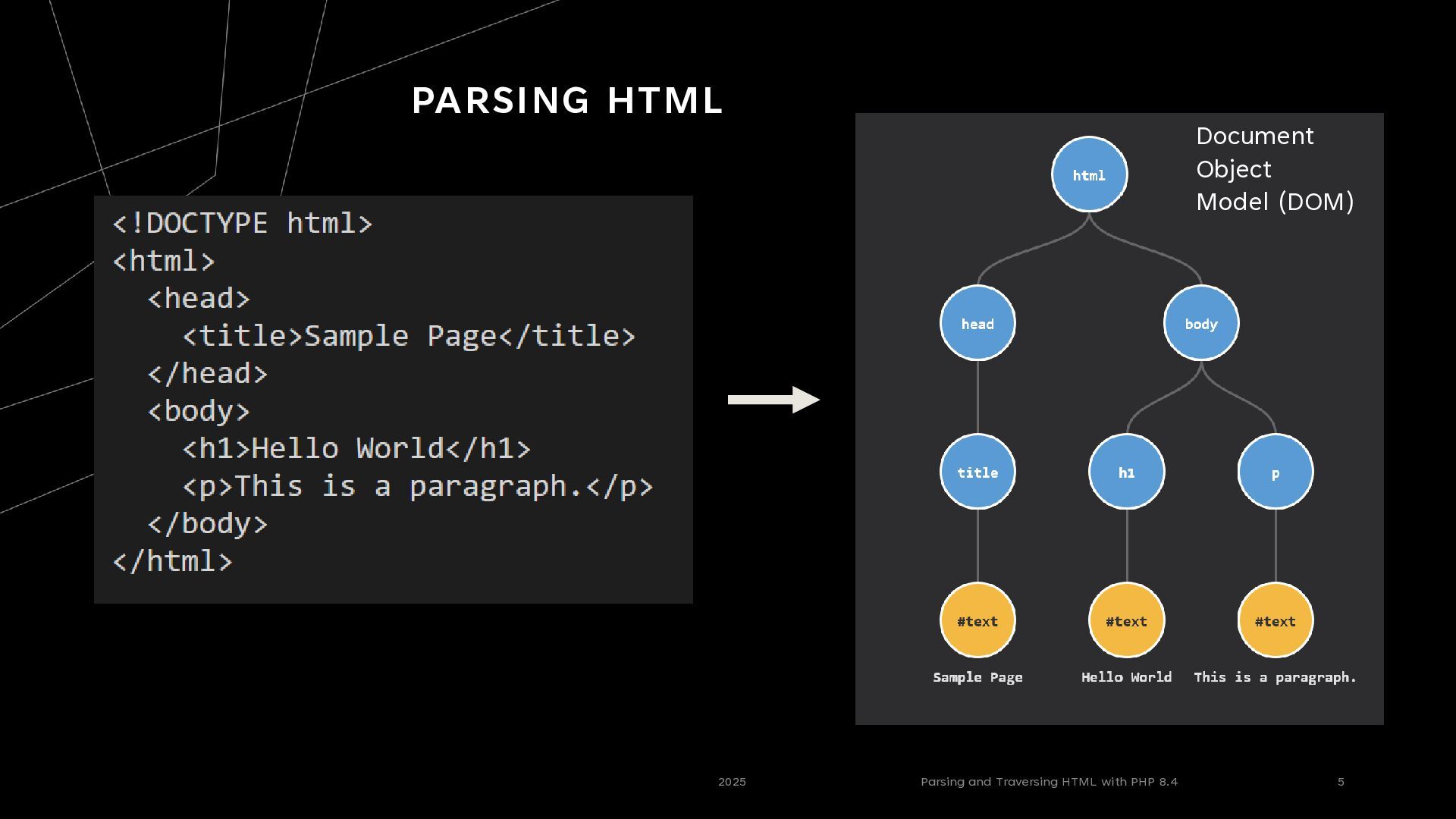 about me and my experience PHP’s new HTML parser Retrieving HTML elements with modern CSS selectors Try out some code 2025 Parsing and Traversing HTML with PHP 8.4 4 PARSING HTML What’s it used for Using the new DOM classes to enable the new features XPATH SELECTORS When to use them CLOSING AND Q&A Useful tools, further reading, Q&A INTRO NEW DOM API IN 8.4