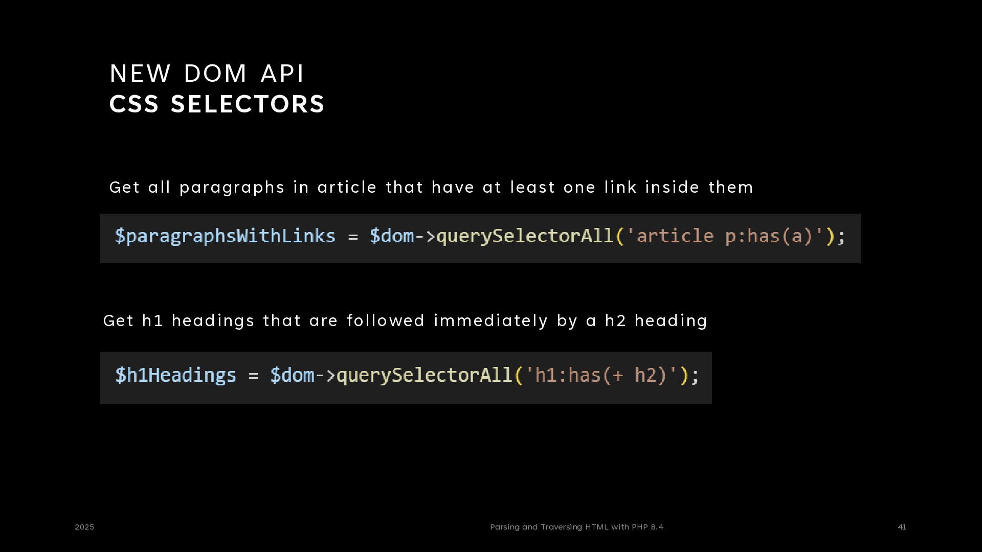 about me and my experience PHP’s new HTML parser Retrieving HTML elements with modern CSS selectors Try out some code 2025 Parsing and Traversing HTML with PHP 8.4 43 PARSING HTML What’s it used for Using the new DOM classes to enable the new features XPATH SELECTORS When to use them CLOSING AND Q&A Useful tools, further reading, Q&A INTRO NEW DOM API IN 8.4