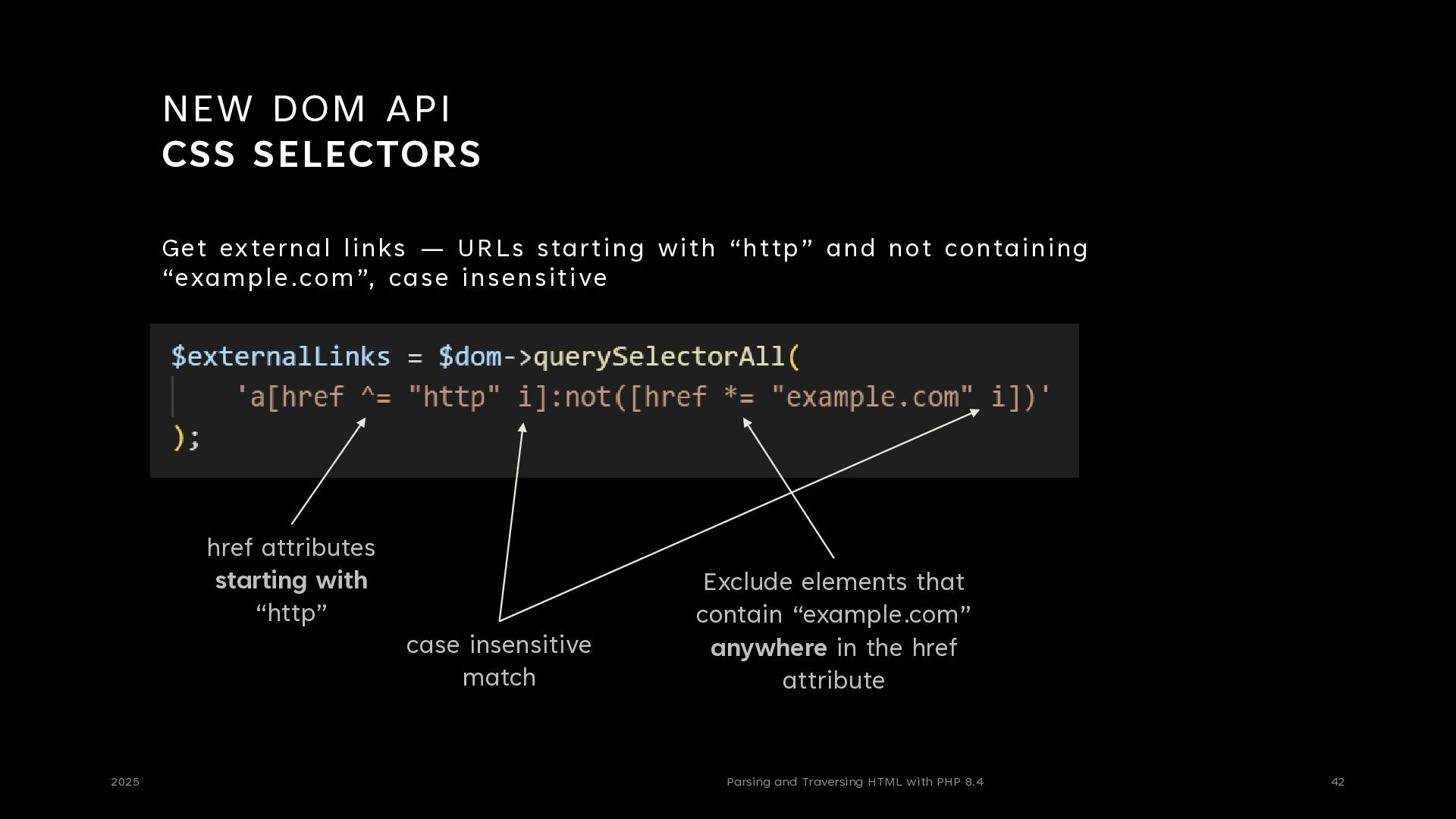 DOM API CSS SELECTORS Get external links — URLs starting with “http” and not containing “example.com”, case insensitive href attributes starting with “http” case insensitive match Exclude elements that contain “example.com” anywhere in the href attribute
