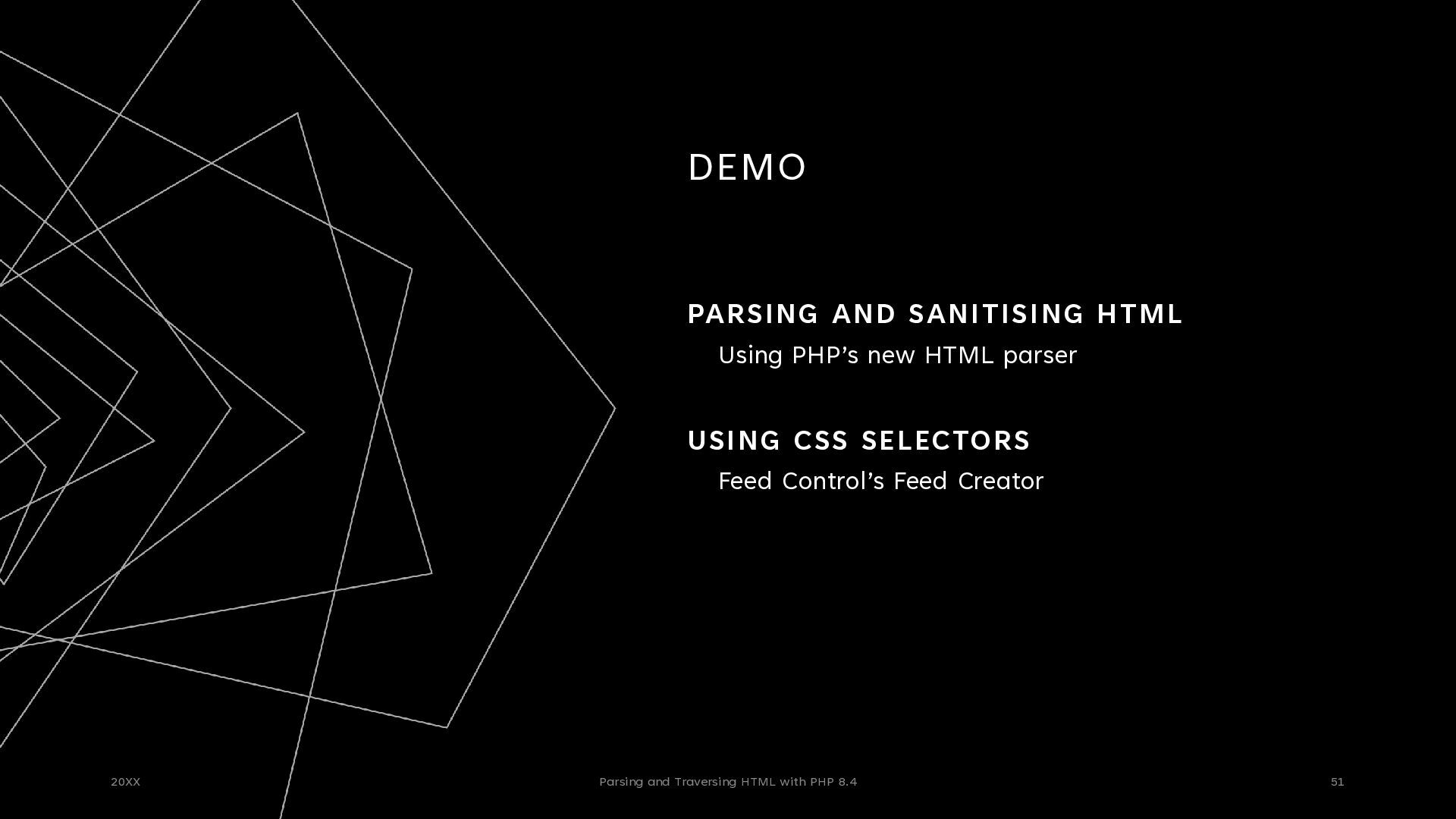 about me and my experience PHP’s new HTML parser Retrieving HTML elements with modern CSS selectors Try out some code 2025 Parsing and Traversing HTML with PHP 8.4 52 PARSING HTML What’s it used for Using the new DOM classes to enable the new features XPATH SELECTORS When to use them CLOSING AND Q&A Useful tools, further reading, Q&A INTRO NEW DOM API IN 8.4