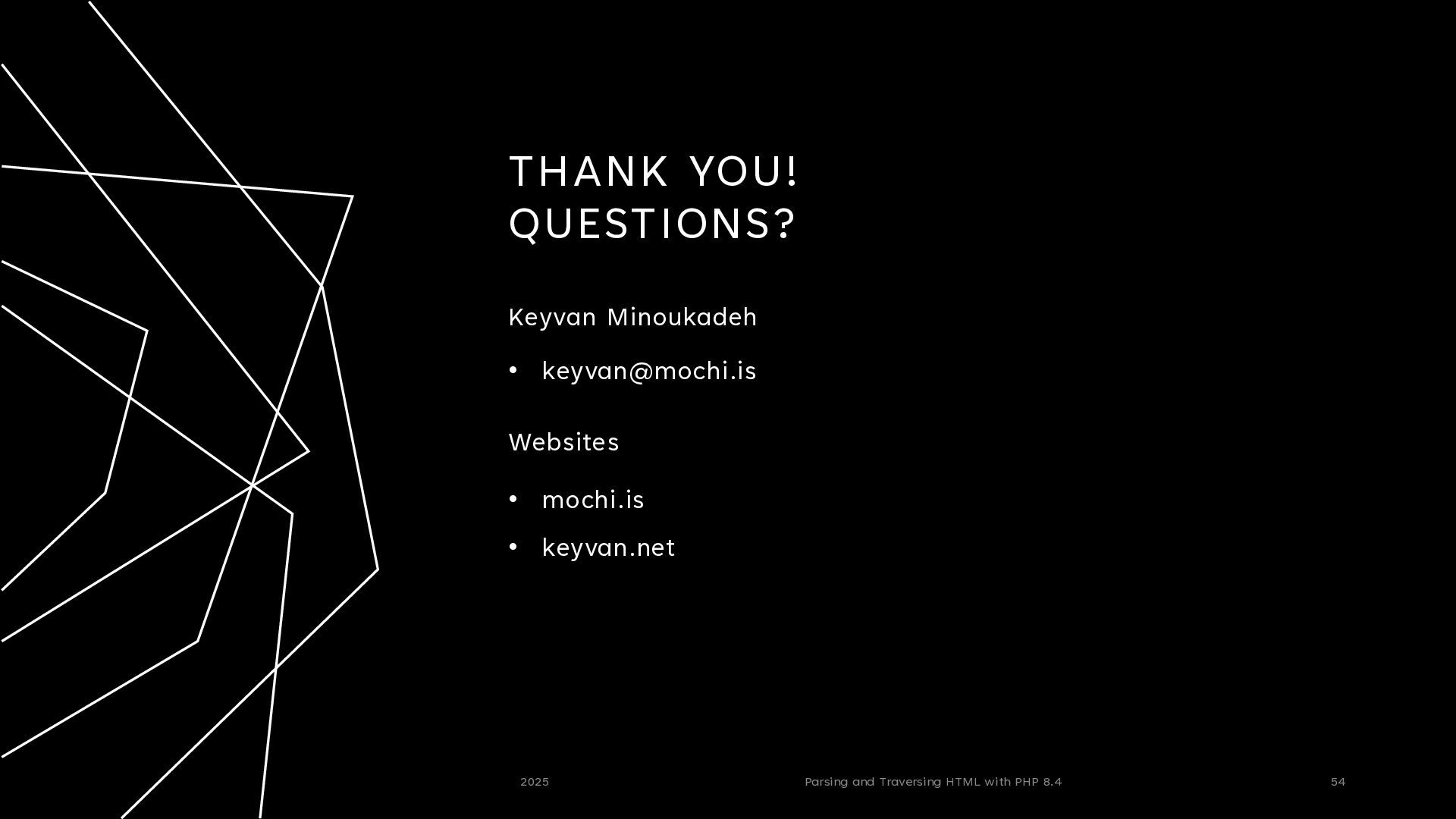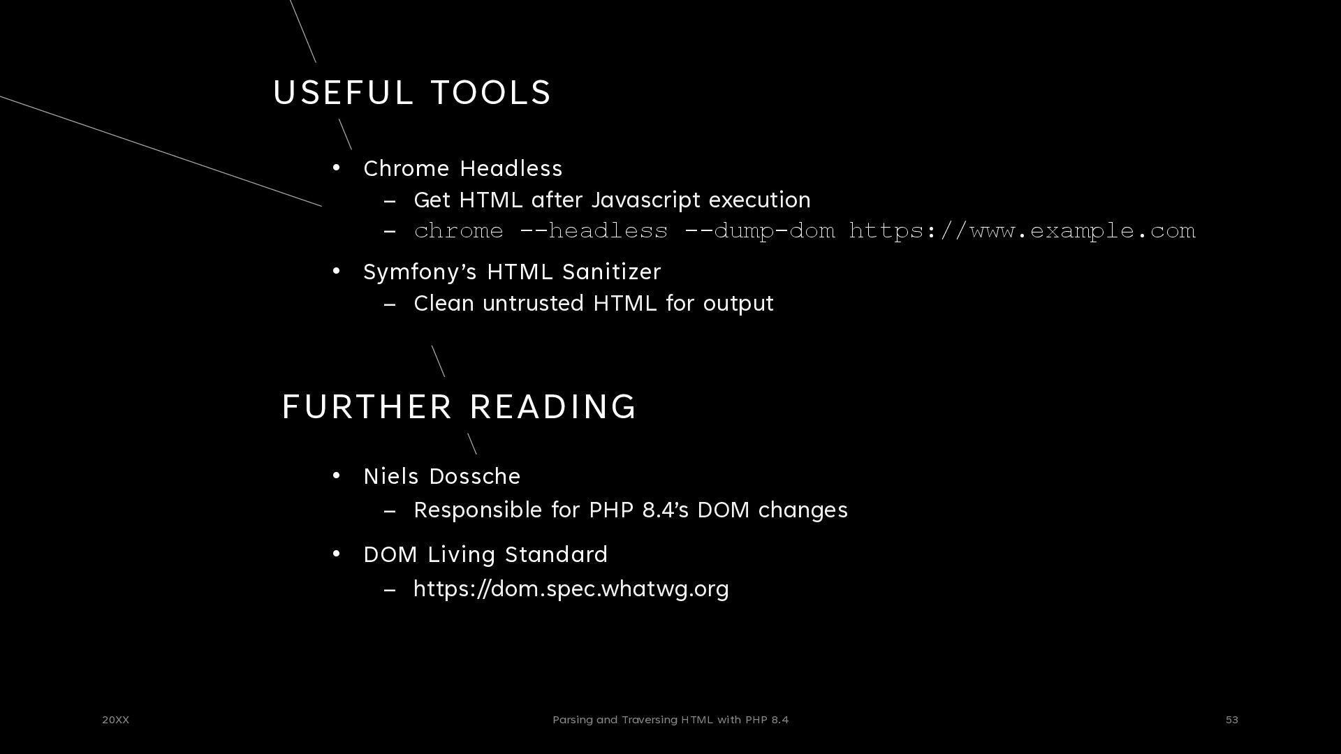 execution – chrome --headless --dump-dom https://www.example.com • Symfony’s HTML Sanitizer – Clean untrusted HTML for output 20XX Parsing and Traversing HTML with PHP 8.4 53 USEFUL TOOLS • Niels Dossche – Responsible for PHP 8.4’s DOM changes • DOM Living Standard – https://dom.spec.whatwg.org