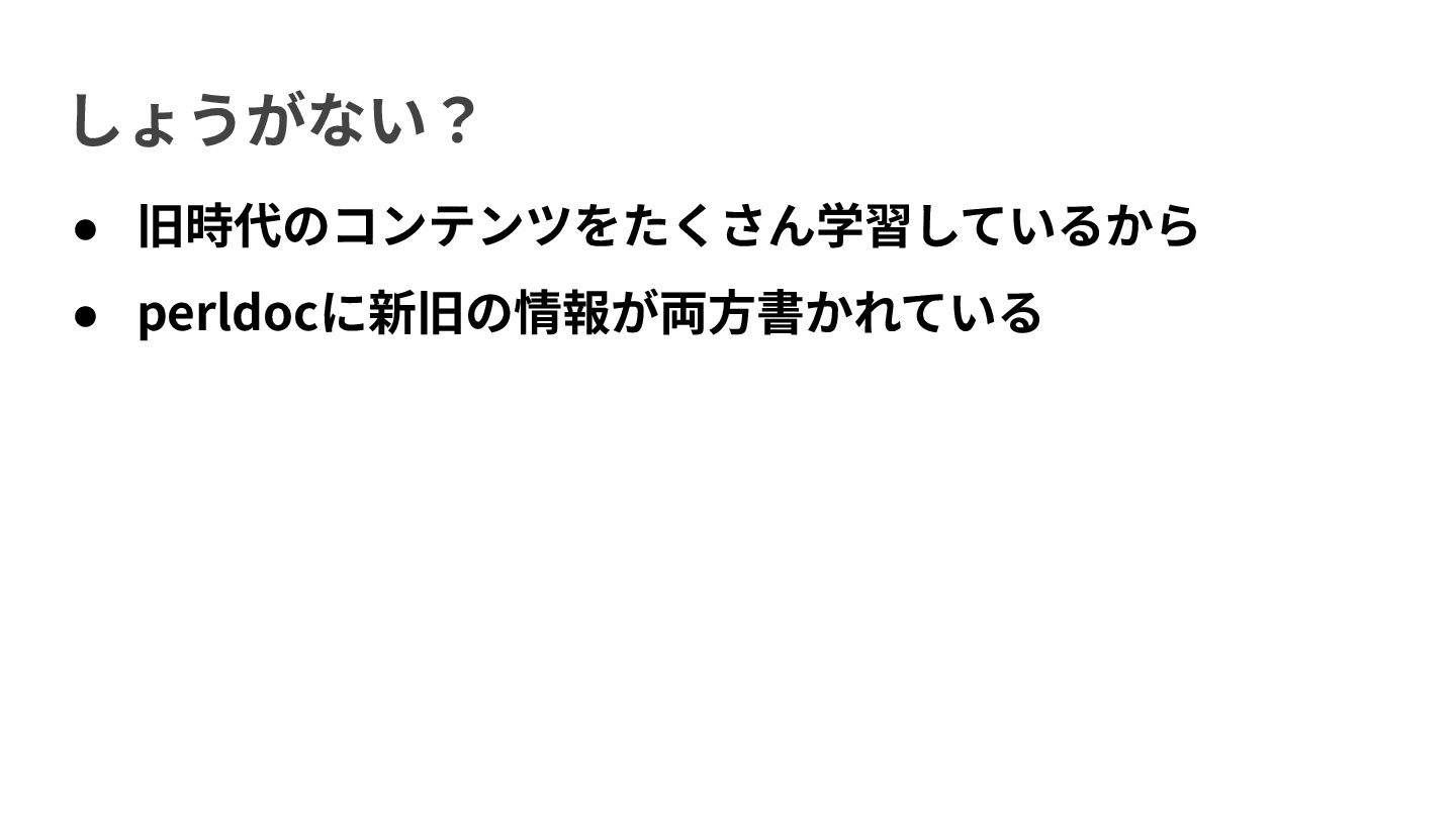 しょうがない? • 旧時代のコンテンツをたくさん学習しているから • perldocに新旧の情報が両⽅書かれている