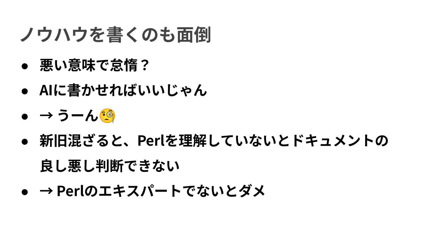 ノウハウを書くのも⾯倒 • 悪い意味で怠惰? • AIに書かせればいいじゃん • → うーん🧐 • 新旧混ざると、Perlを理解していないとドキュメントの