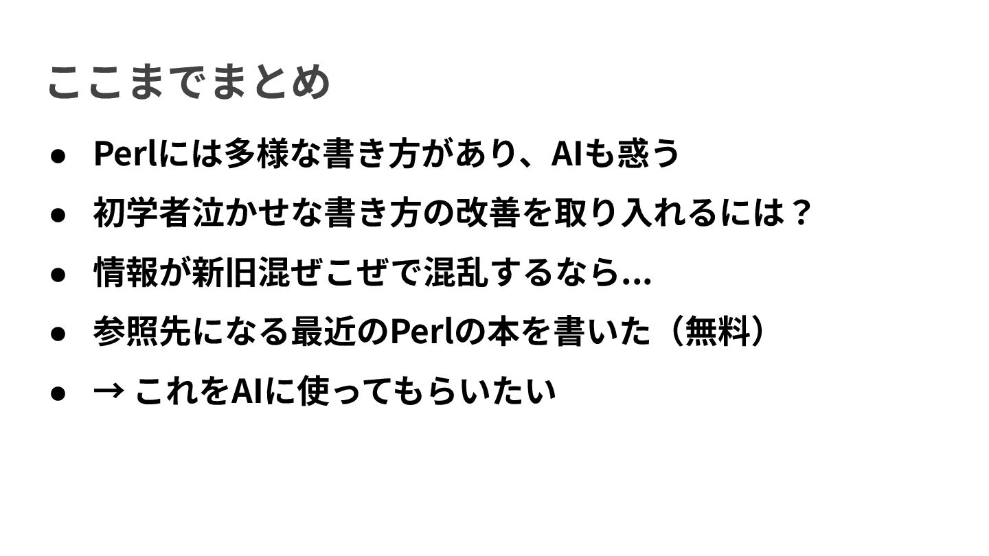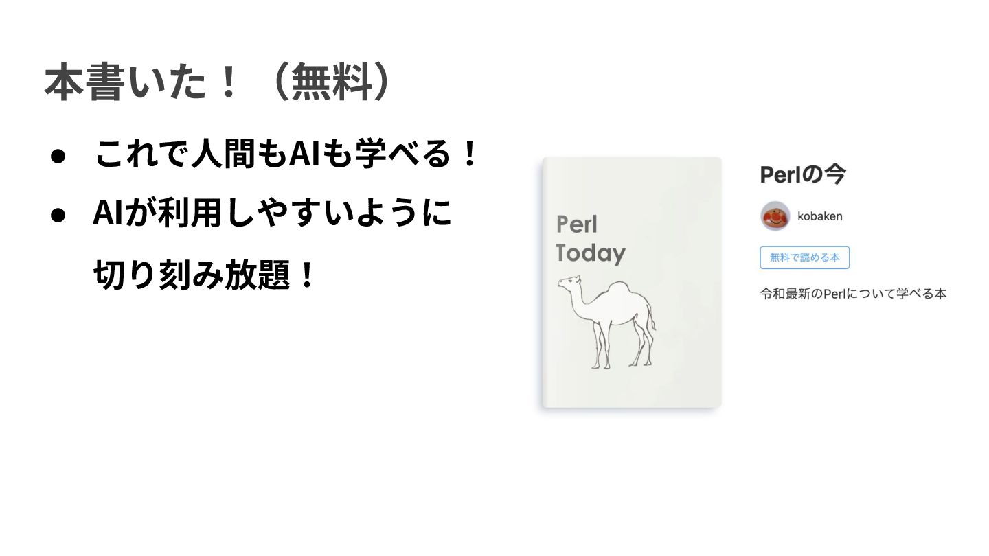 ここまでまとめ • Perlには多様な書き⽅があり、AIも惑う • 初学者泣かせな書き⽅の改善を取り⼊れるには? • 情報が新旧混ぜこぜで混乱するなら... • 参照先になる最近のPerlの本を書いた(無料) •