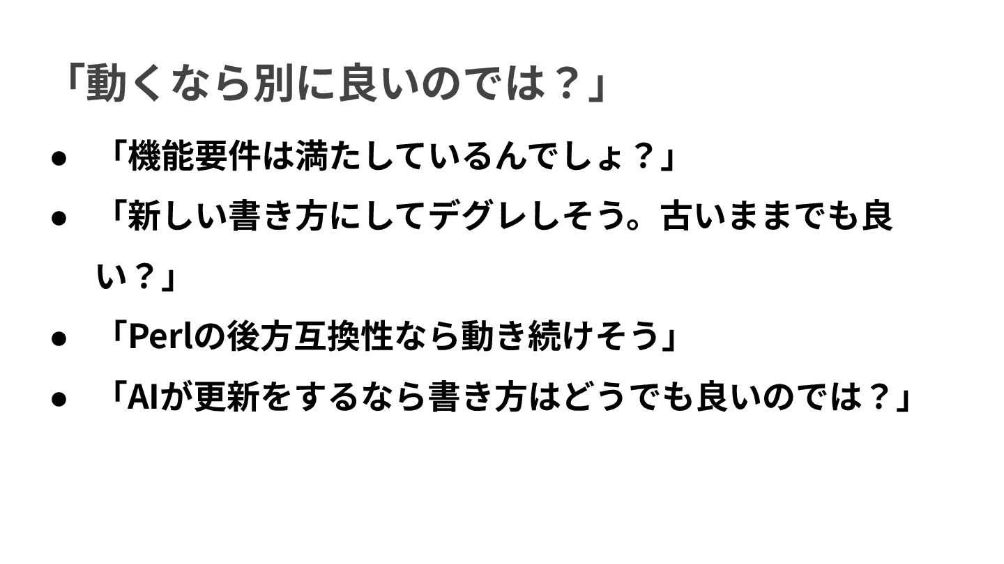 「動くなら別に良いのでは?」 • 「機能要件は満たしているんでしょ?」 • 「新しい書き⽅にしてデグレしそう。古いままでも良 い?」 • 「Perlの後⽅互換性なら動き続けそう」 • 「AIが更新をするなら書き⽅はどうでも良いのでは?」