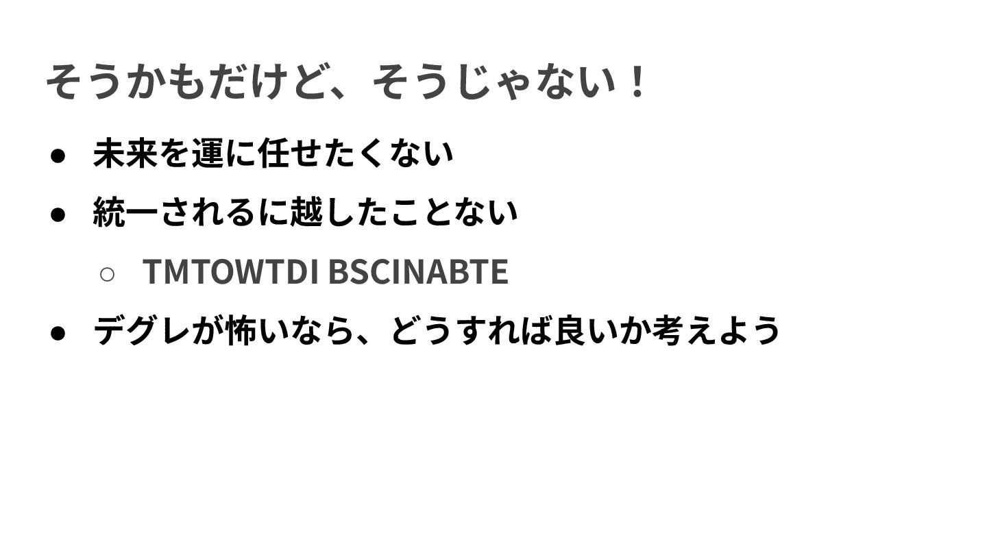 そうかもだけど、そうじゃない! • 未来を運に任せたくない • 統⼀されるに越したことない ◦ TMTOWTDI BSCINABTE • デグレが怖いなら、どうすれば良いか考えよう