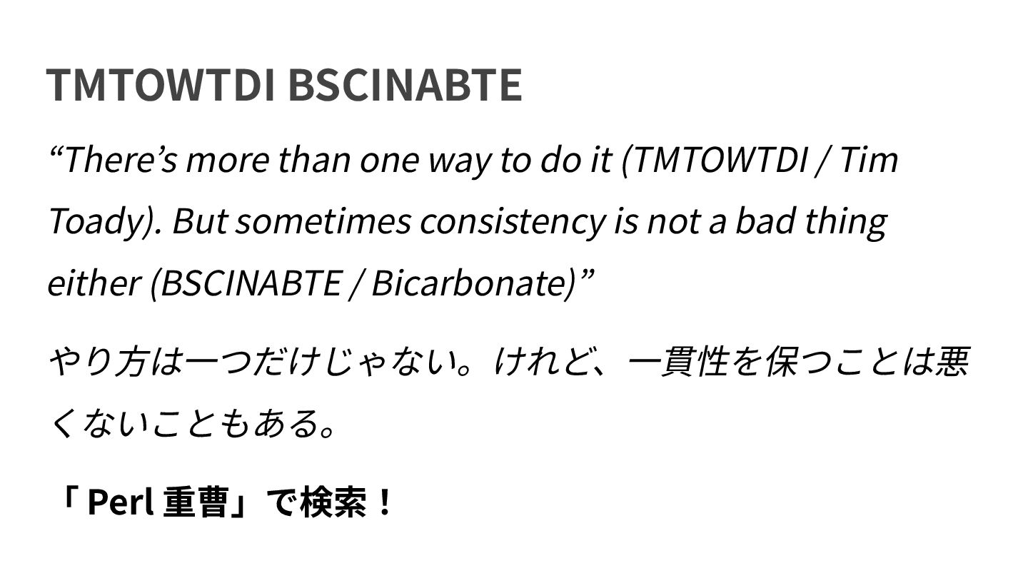 (TMTOWTDI / Tim Toady). But sometimes consistency is not a bad thing either (BSCINABTE / Bicarbonate)” やり⽅は⼀つだけじゃない。けれど、⼀貫性を保つことは悪 くないこともある。 「 Perl 重曹」で検索!