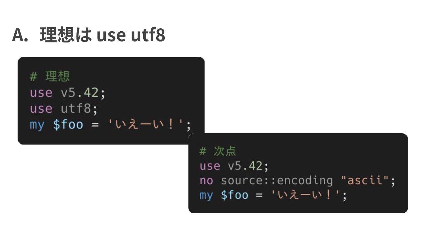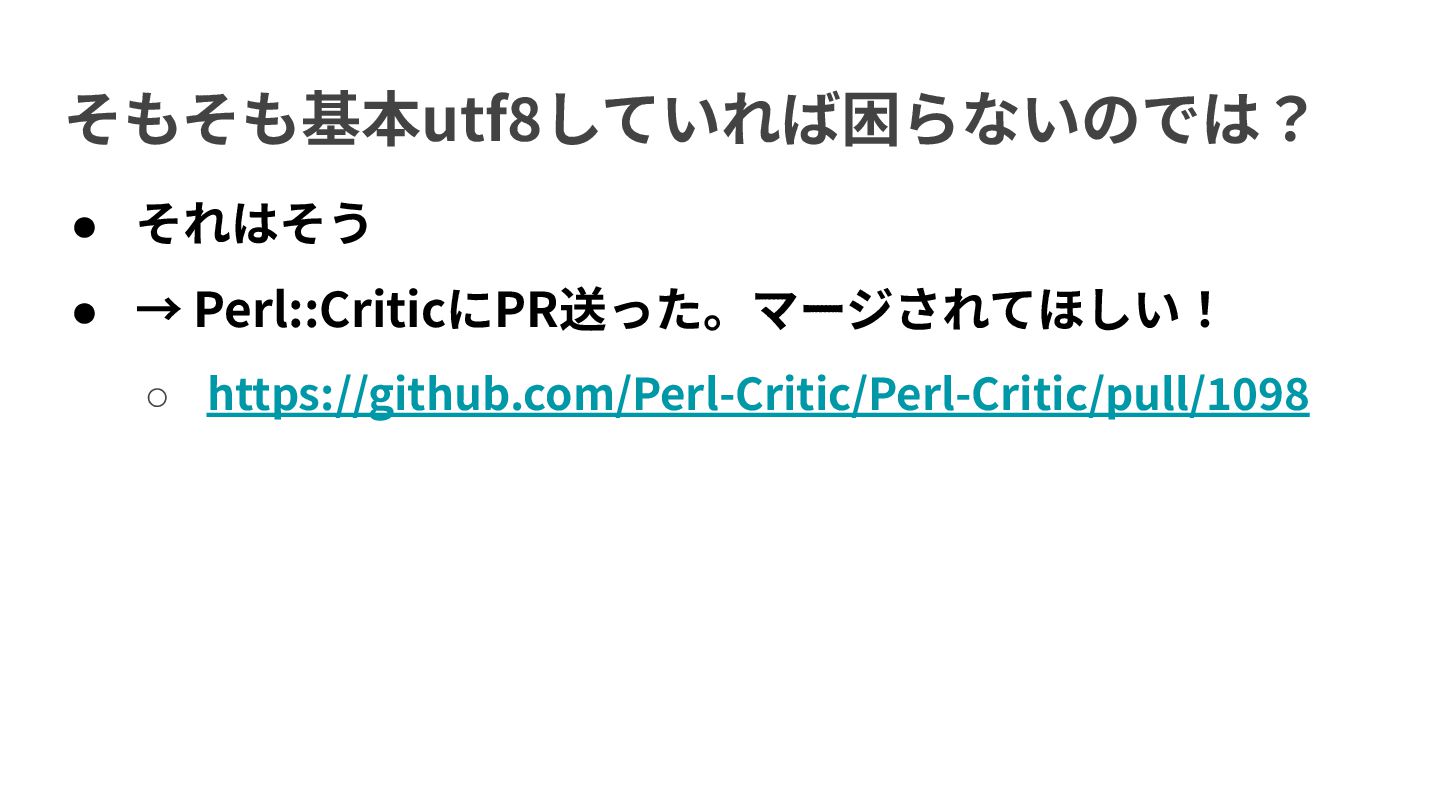 そもそも基本utf8していれば困らないのでは? • それはそう • → Perl::CriticにPR送った。マージされてほしい! ◦ https://github.com/Perl-Critic/Perl-Critic/pull/1098