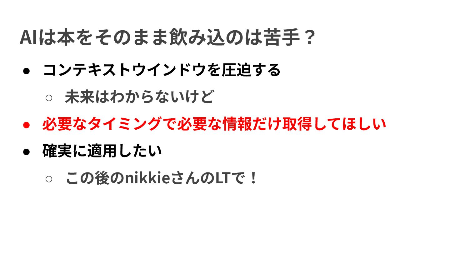AIは本をそのまま飲み込のは苦⼿? • コンテキストウインドウを圧迫する ◦ 未来はわからないけど • 必要なタイミングで必要な情報だけ取得してほしい • 確実に適⽤したい ◦