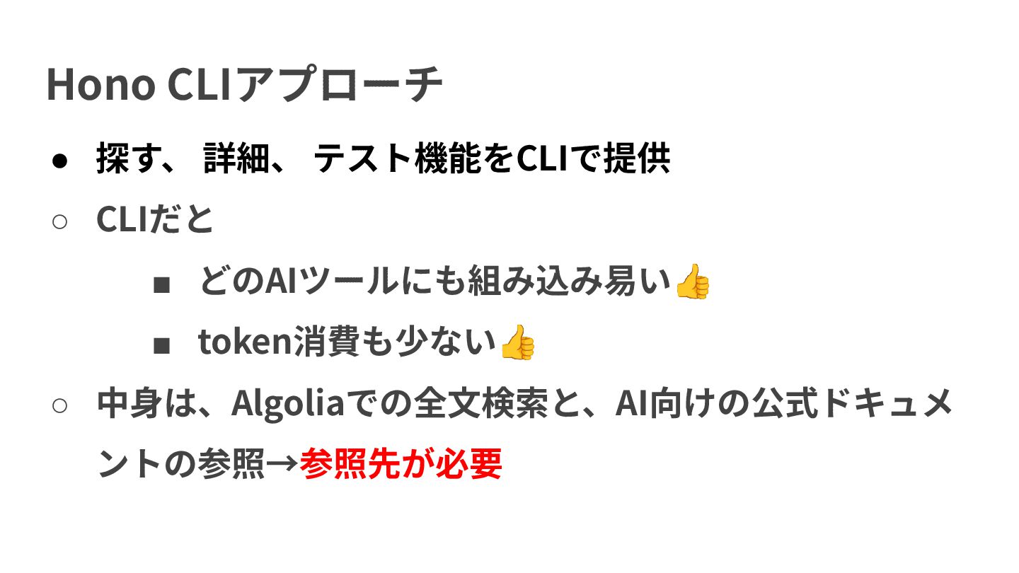 Hono CLIアプローチ • 探す、 詳細、 テスト機能をCLIで提供 ◦ CLIだと ▪ どのAIツールにも組み込み易い👍