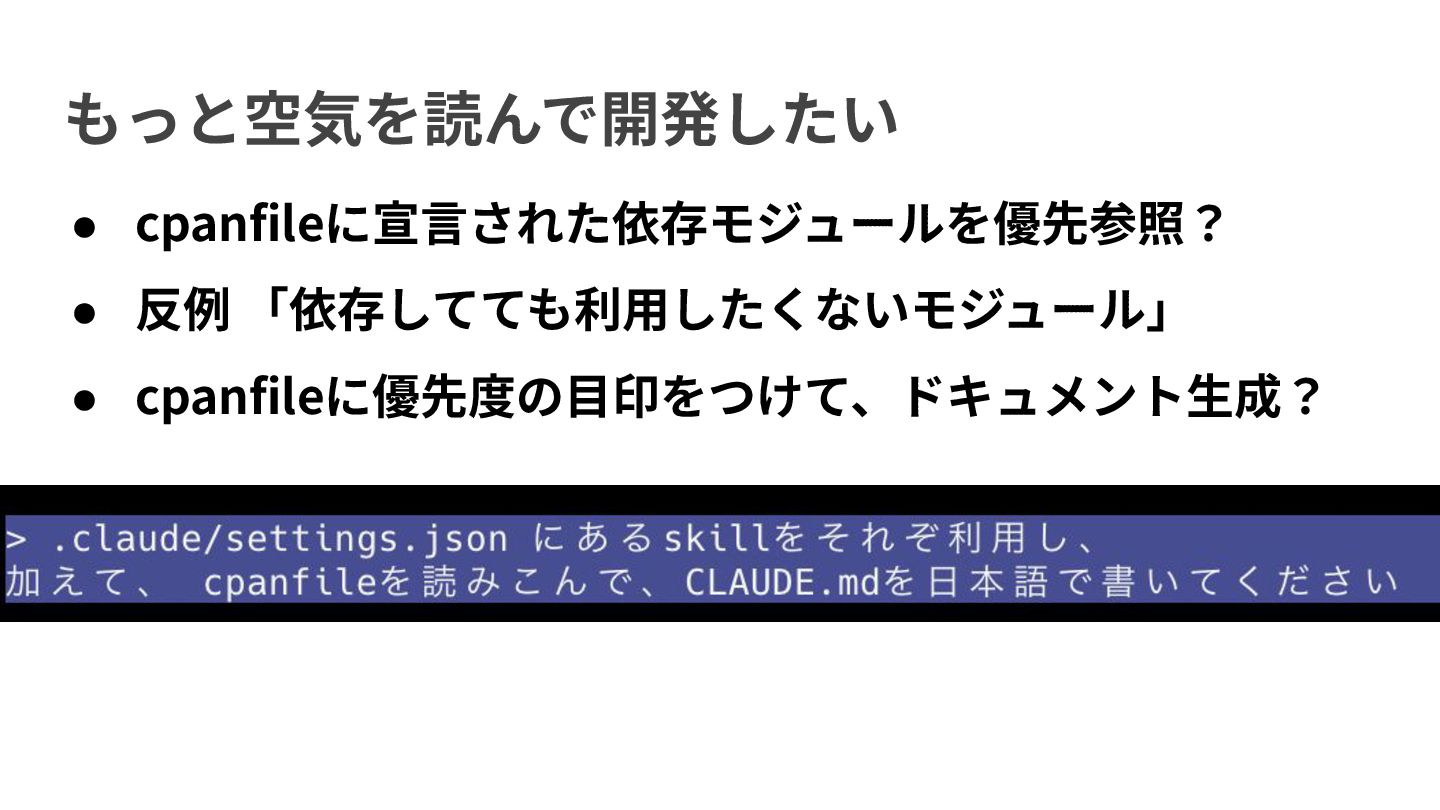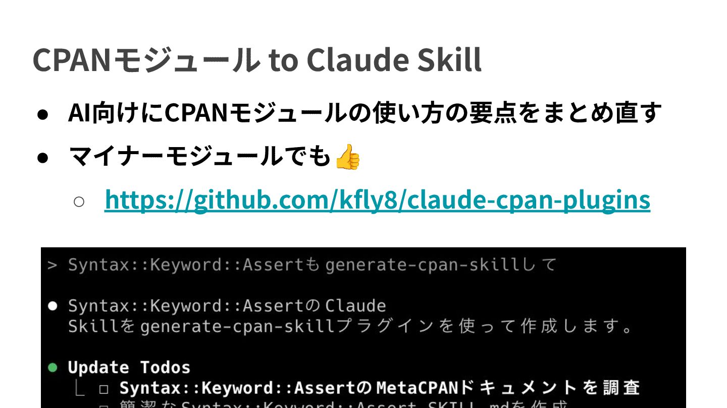 CPANモジュール to Claude Skill • AI向けにCPANモジュールの使い⽅の要点をまとめ直す • マイナーモジュールでも👍 ◦ https://github.com/kfly8/claude-cpan-plugins