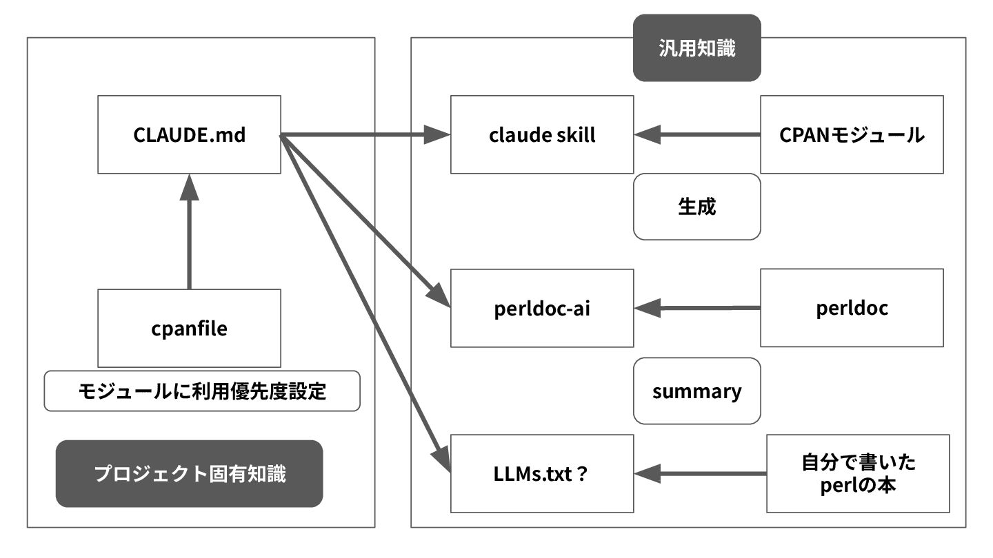 cpanfile CPANモジュール claude skill perldoc perldoc-ai summary 汎⽤知識 CLAUDE.md ⽣成