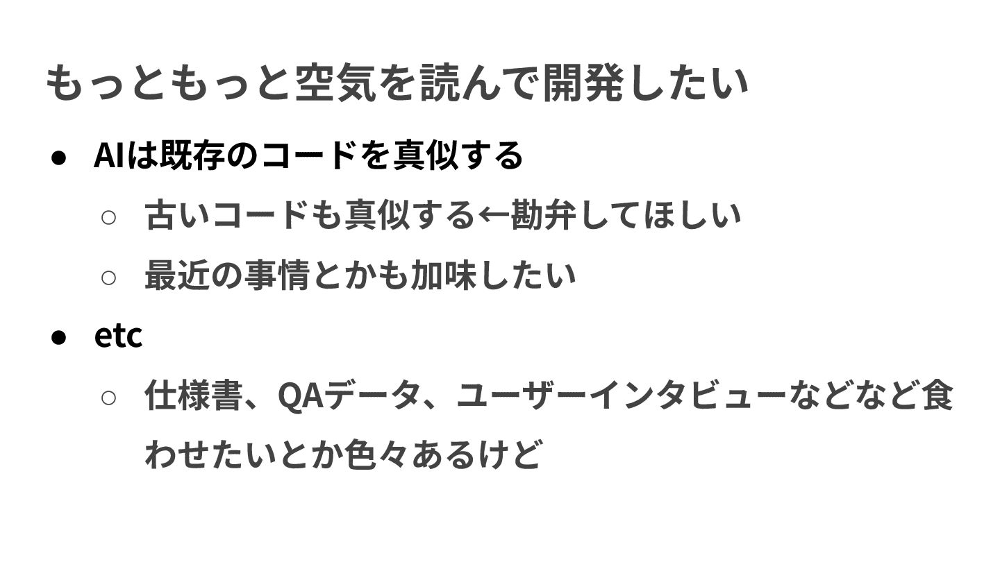 もっともっと空気を読んで開発したい • AIは既存のコードを真似する ◦ 古いコードも真似する←勘弁してほしい ◦ 最近の事情とかも加味したい • etc ◦