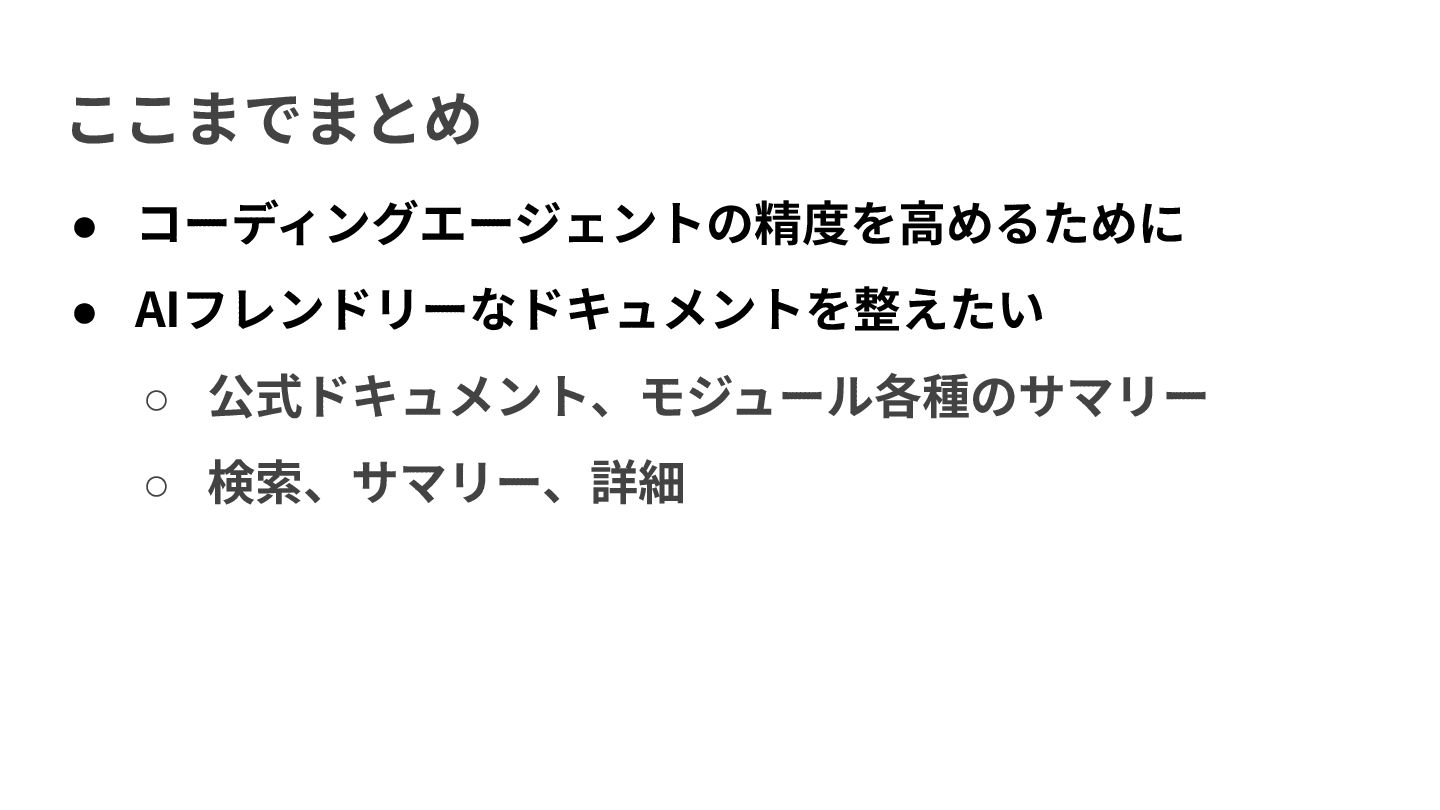 ここまでまとめ • コーディングエージェントの精度を⾼めるために • AIフレンドリーなドキュメントを整えたい ◦ 公式ドキュメント、モジュール各種のサマリー ◦ 検索、サマリー、詳細