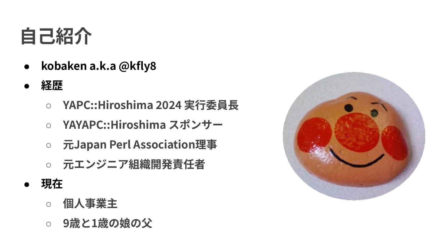 実⾏委員⻑ ◦ YAYAPC::Hiroshima スポンサー ◦ 元Japan Perl Association理事 ◦ 元エンジニア組織開発責任者 • 現在 ◦ 個⼈事業主 ◦ 9歳と1歳の娘の⽗