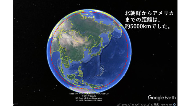北朝鮮からアメリカ までの距離は、 約5000kmでした。