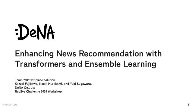 DeNA is an IT company that aims to entertain and to serve through our businesses. ◦ Our AI team tackles different business challenges using a wide range of AI technologies. ◦ One of our focus area is matching technologies (including recommendation). ◦ Our team “:D” is made up of data scientists | Kaggle GM/Master from DeNA. Business portofolio AI Team Reinforcement Learning Matching Computer Vision Multimodal Generative AI