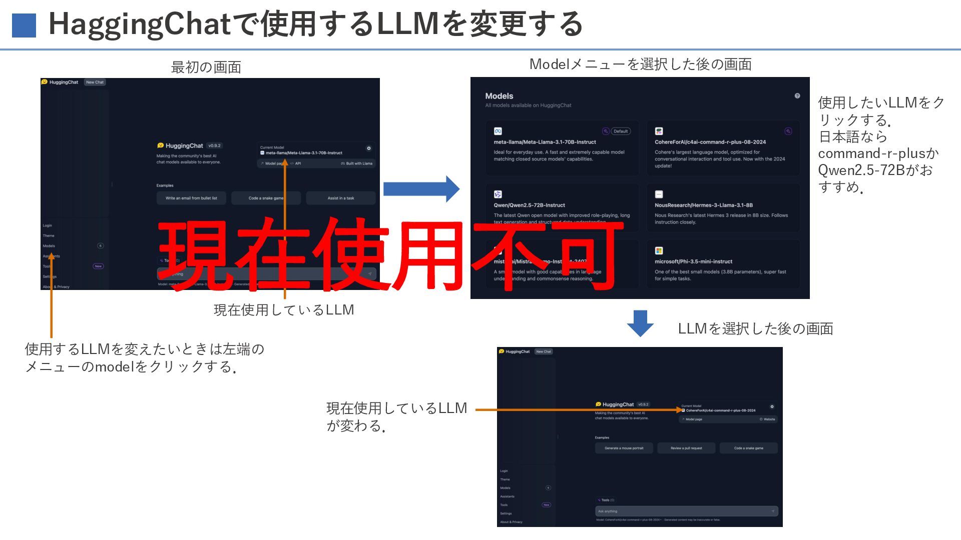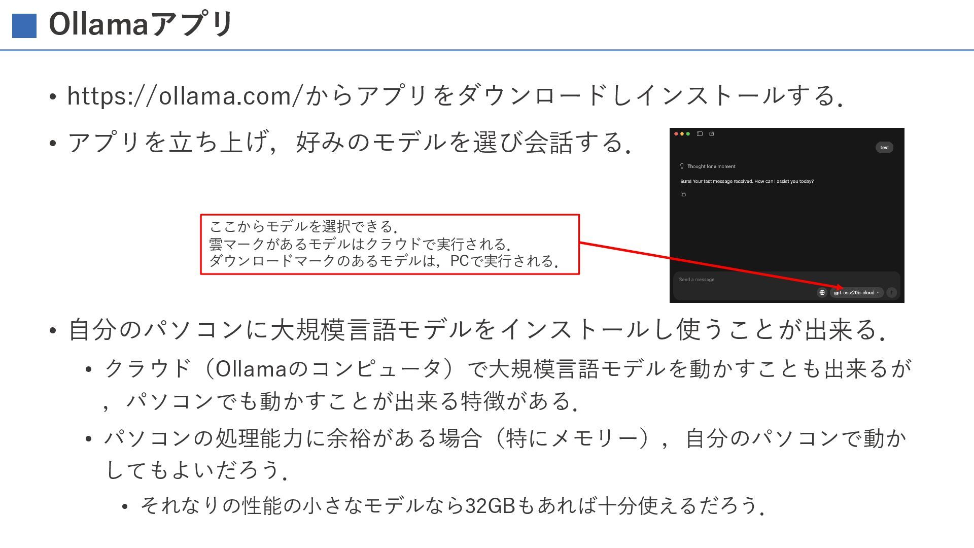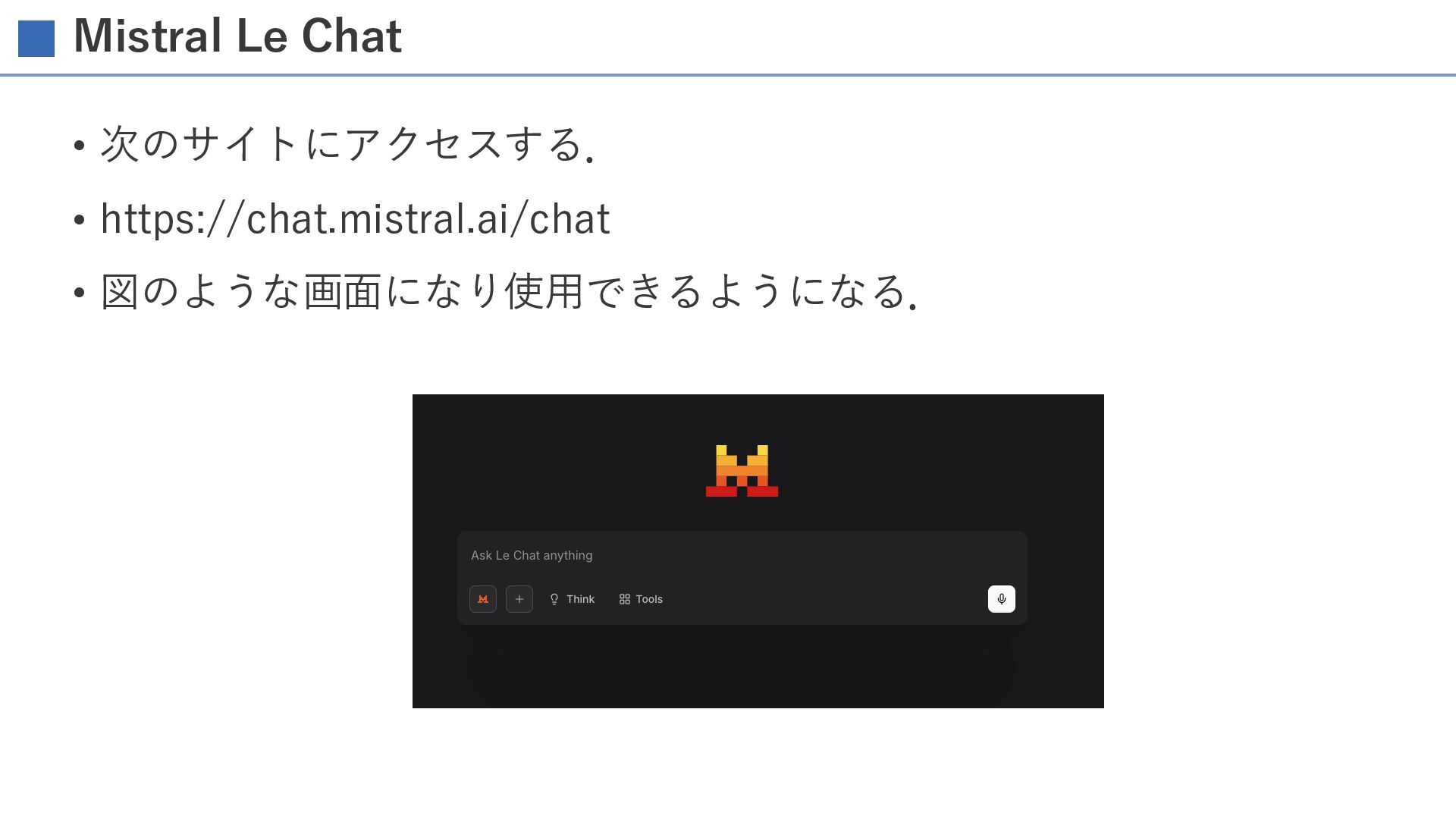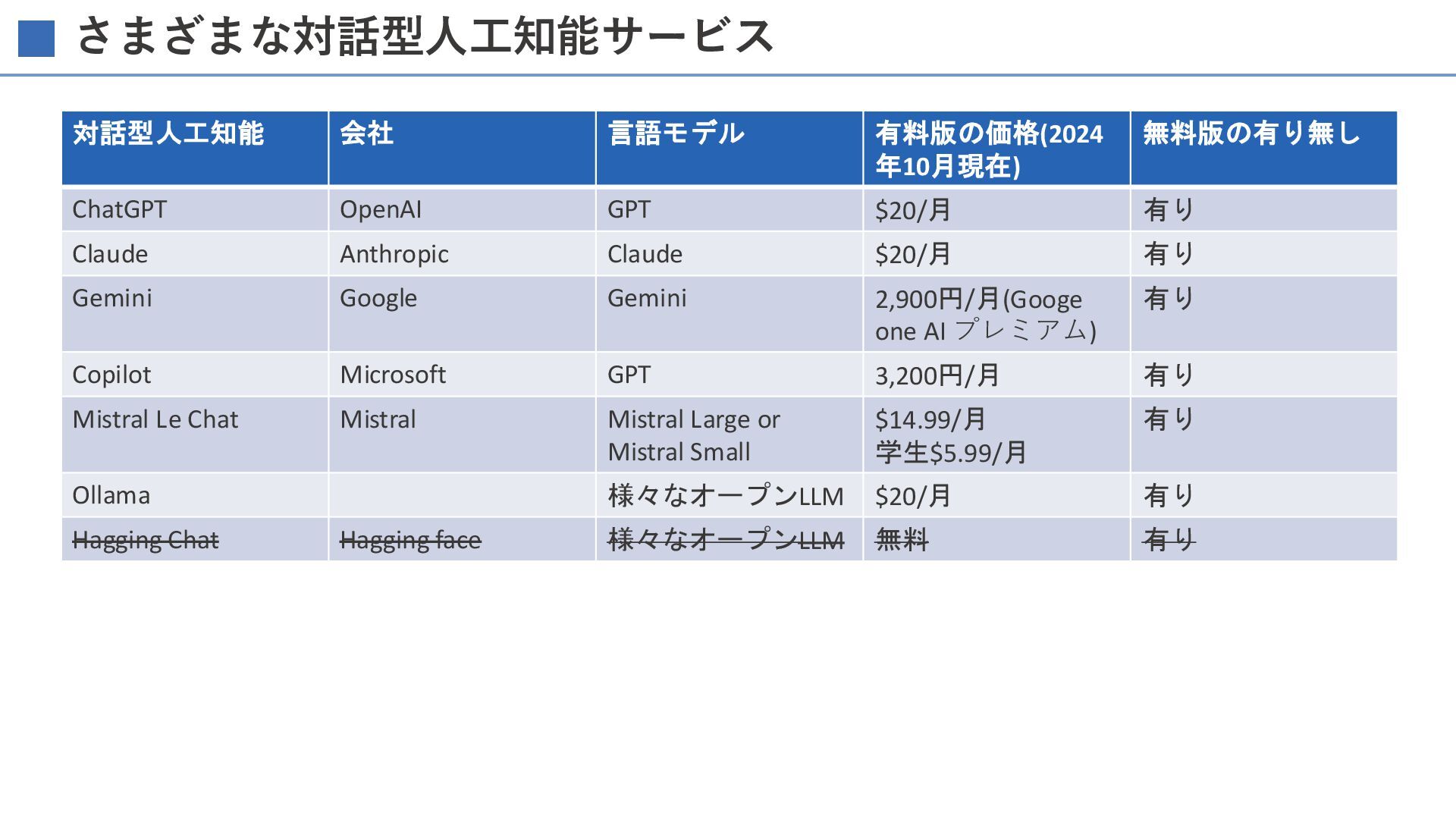 $20/月 有り Claude Anthropic Claude $20/月 有り Gemini Google Gemini 2,900円/月(Googe one AI プレミアム) 有り Copilot Microsoft GPT 3,200円/月 有り Mistral Le Chat Mistral Mistral Large or Mistral Small $14.99/月 学生$5.99/月 有り Ollama 様々なオープンLLM $20/月 有り Hagging Chat Hagging face 様々なオープンLLM 無料 有り