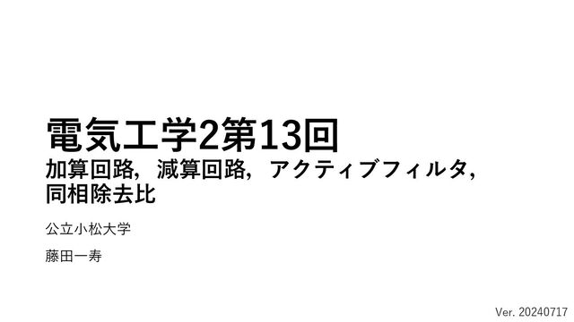 2 5. 4 -1V 1V 1V 20kΩ 40kΩ 80kΩ 80kΩ イマジナリショートから, 反転入力端子 の電圧は非反転入力端子と同じなと見なせ るので0Vである.つまり入力につながる各 抵抗にかかる電圧は,それぞれがつながっ ている入力電源の電圧そのものである. よって,20kΩ,40kΩ,80kΩの抵抗を 流れる電流はオームの法則から,それぞれ 𝐼1 = − 1 20𝑘 A,𝐼2 = 1 40𝑘 A, 𝐼3 = 1 80𝑘 Aである. オペアンプの入力インピーダンスは無限 大なので,電流 𝐼1 , 𝐼2 , 𝐼3 は80kΩの電流に流 れる.よって,80kΩの抵抗に流れる電流𝐼 は,𝐼 = 𝐼1 + 𝐼2 + 𝐼3 にかかる電圧は, 𝑉𝑓 = 80𝑘𝐼 = 80𝑘 × − 1 20𝑘 + 1 40𝑘 + 1 80𝑘 = −4 + 2 + 1 = −1𝑉 出力電圧𝑉 𝑜 は80kΩにかかる電圧に−1かけ ればよいから, 𝑉 𝑜 = 1 黄色の回路を時計回りにを考えると,入力端子は0V,80kΩの抵 抗で−1V下がる,最後に0Vにならなければならないので出力電 圧は1Vである. また電流は反時計回りに回っているので,出力電圧を電池と見 なすと上向きを+にしなければならない(つまり正である). 黄色の回路の電圧降下の図