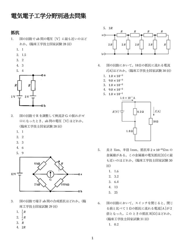 1 3. 2 4. 5 5. 8 81. 図のような CR 直列回路に連続した方形波を入 力させたときについて正しいのはどれか.(33 回国家試験) 1. 抵抗の両端電圧𝑣𝑅 は積分波形を⽰す. 2. 回路の時定数は 0.47μs である. 3. パルス幅に対して時定数は⼗分小さい. 4. 𝑣𝑖 ≈𝑅⋅𝑖と表すことができる. 5. キャパシタの両端電圧𝑣𝐶 の波形はほぼ三角波 となる. 82. コンデンサを 10V に充電した後,100Ωの抵抗 で放電した場合のコンデンサにかかる電圧の経 時変化を図の片対数グラフを⽰す.コンデンサ の静電容量[F]はどれか.(臨床工学技士国家試 験 34) 1. 0.02 2. 0.04 3. 0.1 4. 0.2 5. 0.4 83. 図の回路で,スイッチが①の状態で⼗分な時間 が経過した後に,SW を②に入れた.正しいの はどれか.(臨工学技士国家試験 36) a. 回路の時定数は 5𝜇s である. b. SW を②に入れた瞬間の𝑉𝐶 の値は 10V であ る. c. SW を②に入れた瞬間の回路に流れる電流は 100mA である. d. SW を②に入れた 5ms 後の𝑉𝑅 の値は約 3.7V で ある. e. SW を②に入れてから⼗分時間が経過した後 の回路に流れる電流は 0mA である. 1. a, b, c 2. a, b, e 3. a, b, e 4. b, c, d 5. c, d, e インダクタ回路 84. 図の正弦波交流回路で抵抗 R の両端電圧が 60V のとき、コイル L の両端の電圧[V]はどれか。 (臨床工学技士国家試験 30 回) 1. 0 2. 20 3. 40