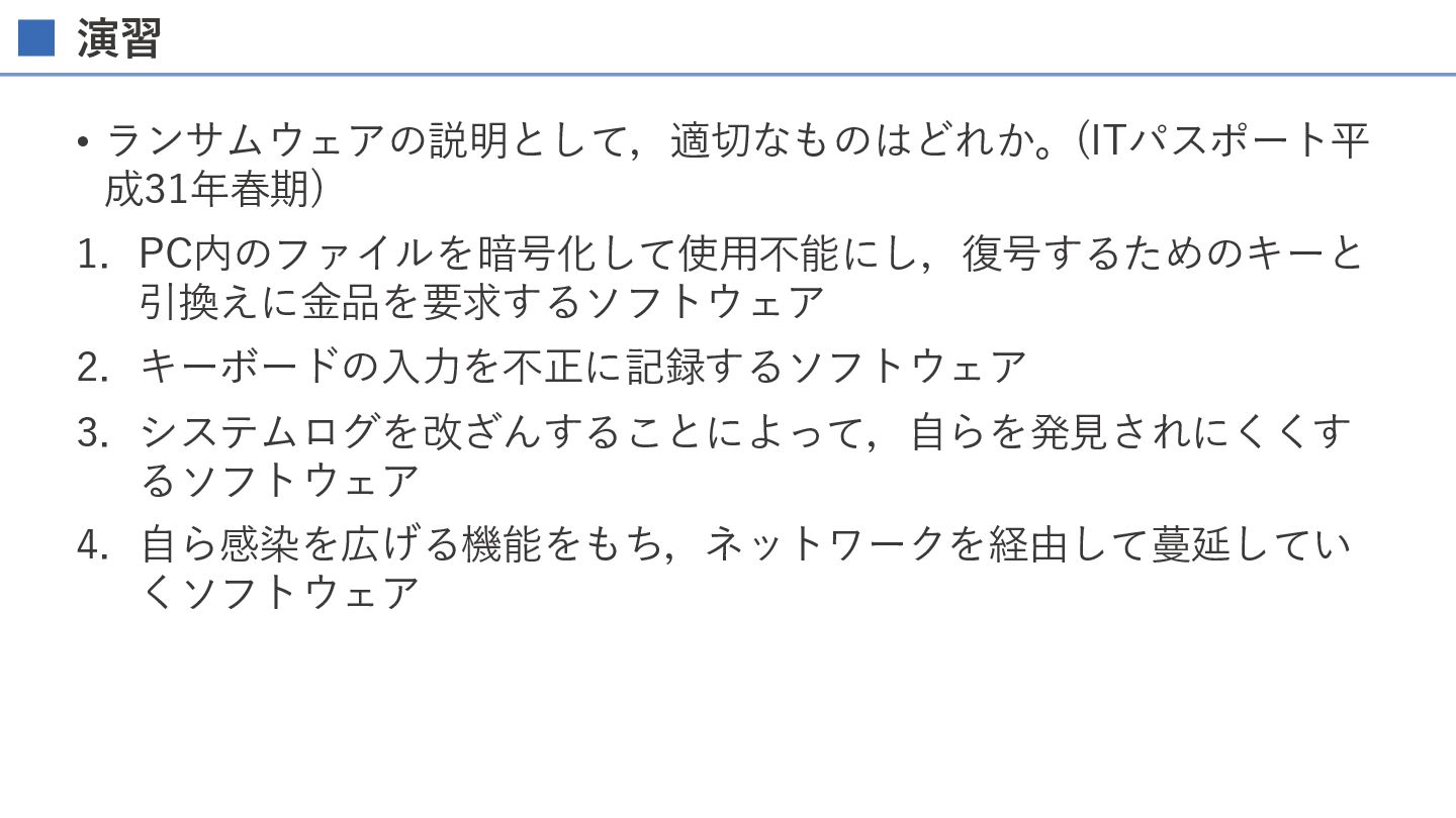 ハードウェア・産業構造 • 第4回 ソフトウェアの種類・ライセ ンス・特許 • 第5回 インターネットとビジネス • 第6回 コンピュータネットワークの 仕組み • 第7回 情報セキュリティ • 第8回 IoTとビッグデータ • 第9回 人工知能1 -人工知能時代の 到来- • 第10回 人工知能2 -人工知能を実現 するには- • 第11回 人工知能3 -人工知能の技術 - • 第12回 人工知能4 -人工知能を使い こなす上で必要な能力- • 第13回 人工知能5 -人工知能研究者 はどこに進めばよいのか- • 第14回 人工知能6 -プロンプトエン ジニアリング- • 第15回 人工知能7 -人工知能のリス ク-