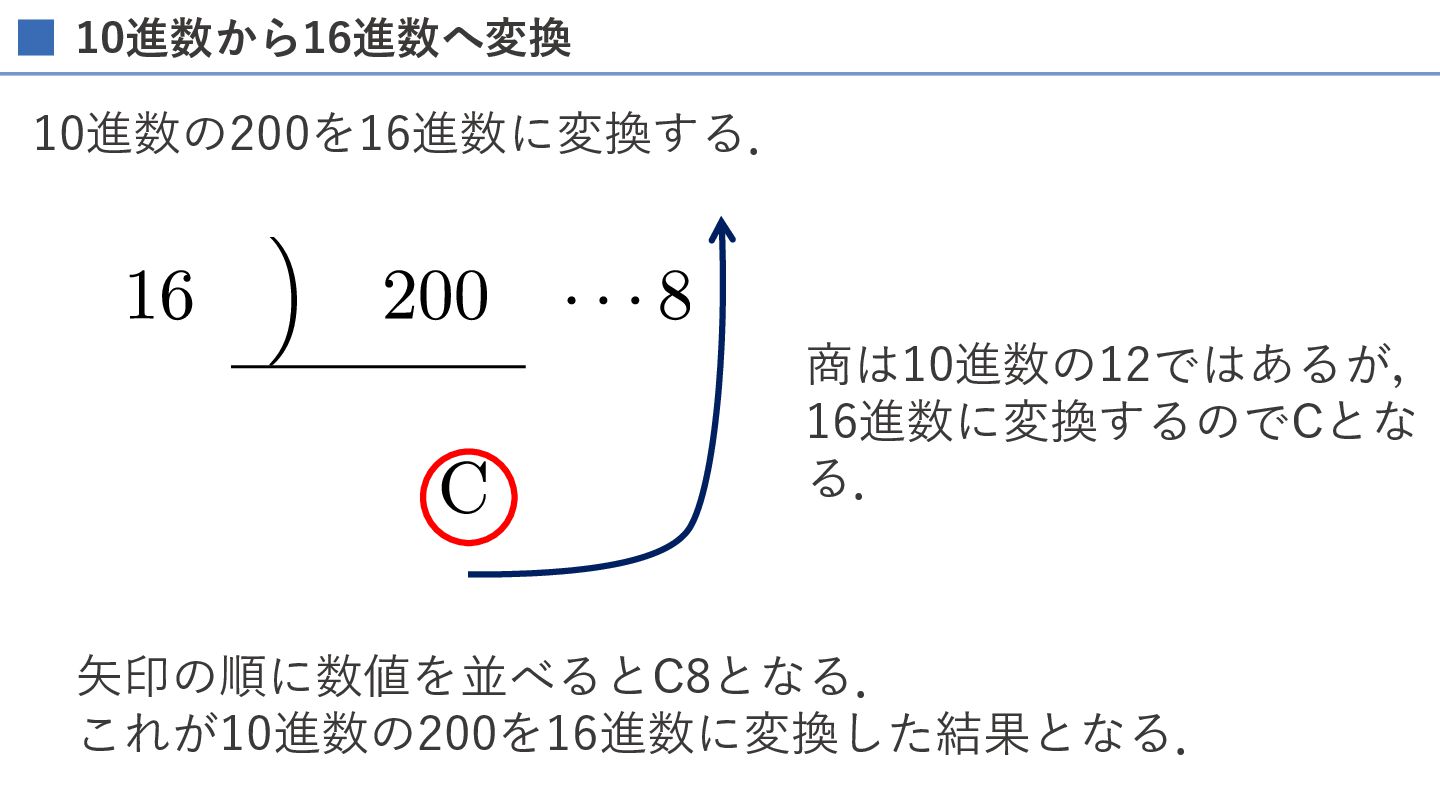 10進数から16進数へ変換 10進数の200を16進数に変換する. 商は10進数の12ではあるが, 16進数に変換するのでCとな る. 矢印の順に数値を並べるとC8となる. これが10進数の200を16進数に変換した結果となる.