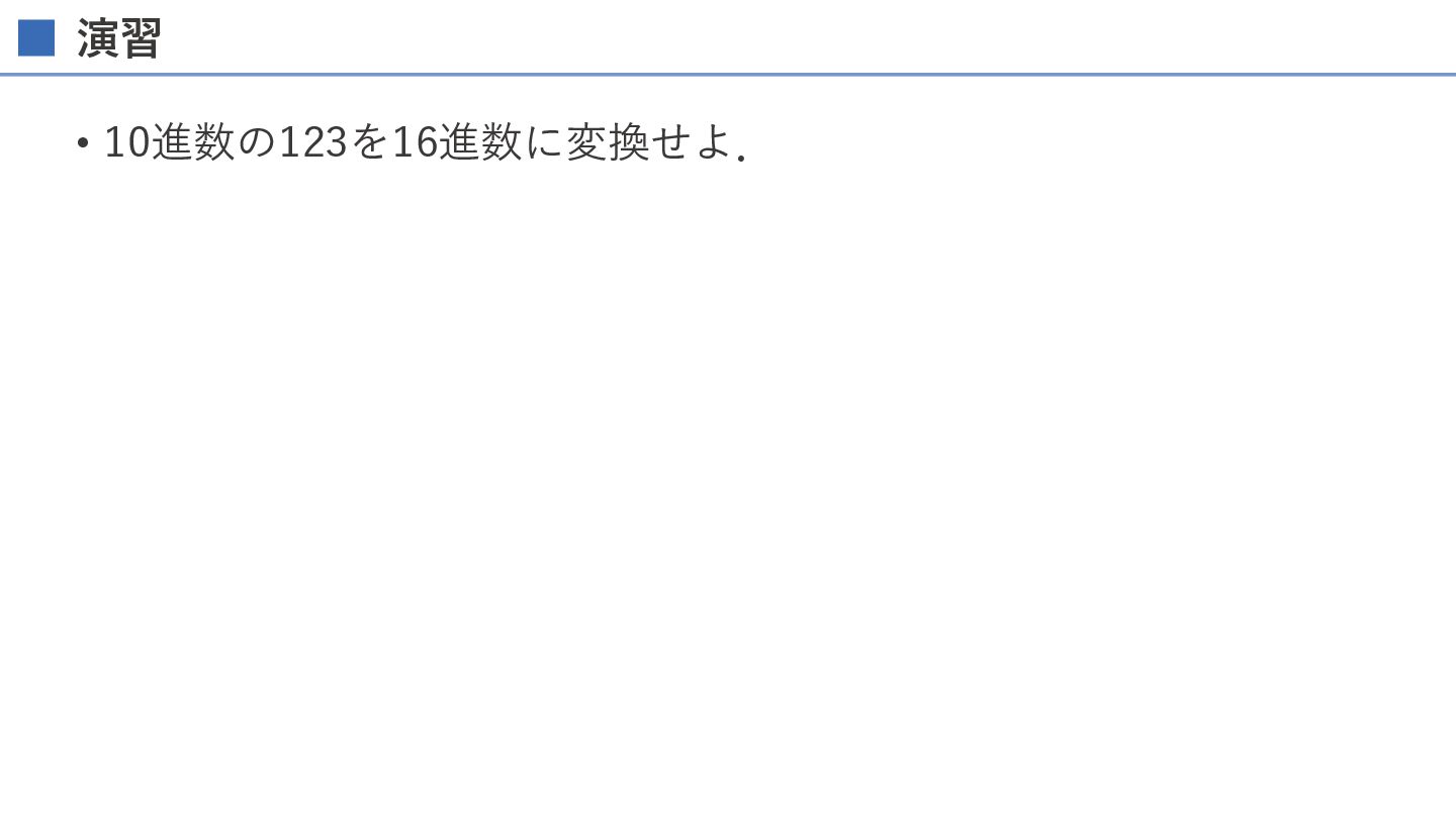 演習 • 2進数の101011010010を16進数に変換せよ.