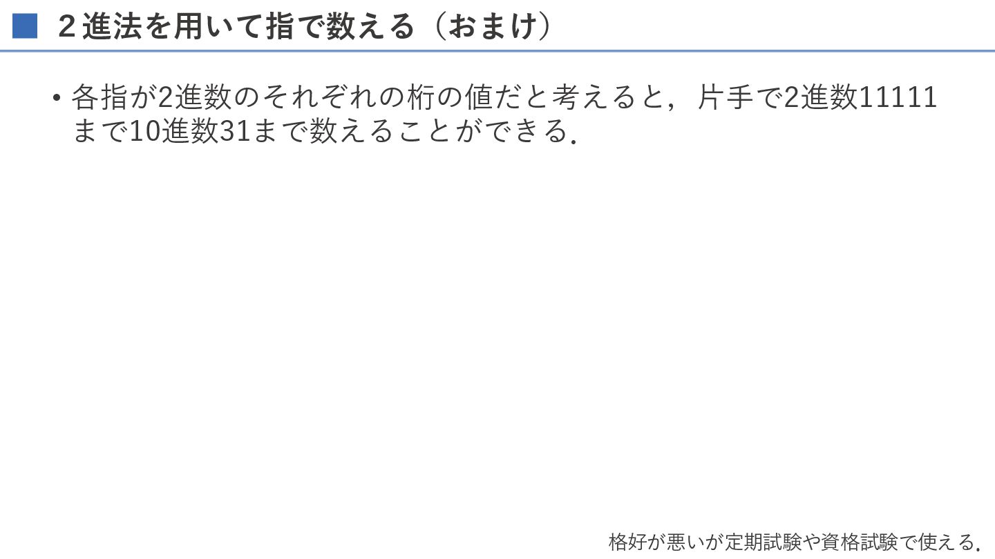 2進法を用いて指で数える(おまけ) • 各指が2進数のそれぞれの桁の値だと考えると,片手で2進数11111 まで10進数31まで数えることができる. 格好が悪いが定期試験や資格試験で使える.