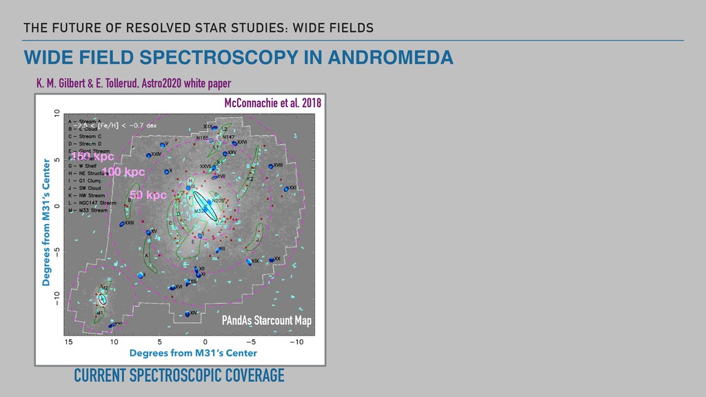 M31$dSphs$ Giant$Southern$ Stream$ M31$Halo$Fields$ PAndAS$M31$Map$ (McConnachie$et$al.)$ Dwarf$Galaxy$Fields$ M31$ N185$ N147$ M33$ 30$kpc$ 90$kpc$ 150$kpc$ 60$kpc$ N$ E$ M31$dSphs$ Giant$Southern$ Stream$ M31$Halo$Fields$ PAndAS$M31$Map$ (McConnachie$et$al.)$ Dwarf$Galaxy$Fields$ Deep DEIMOS spectra completed in progress DECIPHERING ANDROMEDA’S MERGER HISTORY: CHEMICAL ABUNDANCES BUILDING A STATISTICAL CENSUS OF CHEMICAL ABUNDANCES Existing SPLASH data Coadd low SNR spectra Mean [Fe/H], [ /Fe] abundances New Spectroscopic Campaign Obtain deep data in strategic dSph and halo fields Distributions of [Fe/H], [ /Fe] abundances M31’s halo: from 4 stars to 240 stars Extension of spectral synthesis method to lower resolution (R~3000) Jennifer Wojno Ivanna Escala Evan Kirby NSF AST-1614569 (PI K. M. Gilbert) and AST-1614081 (PI Kirby) M31$ N185$ N147$ M33$ 30$kpc$ 90$kpc$ 150$kpc$ 60$kpc$ N$ E$ M31$dSphs$ Giant$Southern$ Stream$ M31$Halo$Fields$ PAndAS$M31$Map$ (McConnachie$et$al.)$ Dwarf$Galaxy$Fields$ Escala et al. 2019 Gilbert et al. 2019, Escala et al. 2020, Kirby et al. 2019, + Wojno et al. subm.